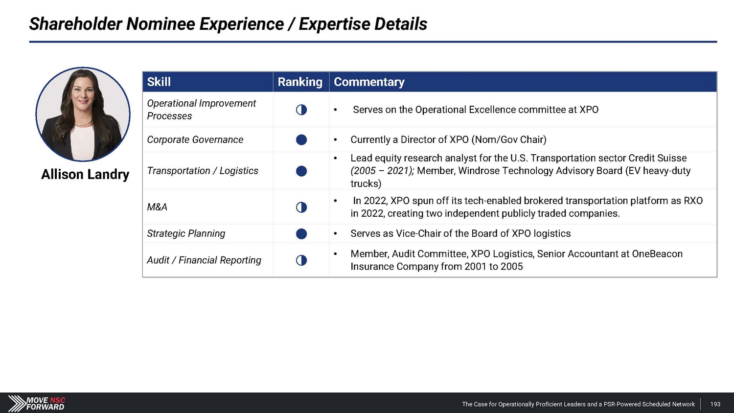 Allison Landry Shareholder Nominee Experience / Expertise Details Skill Ranking Commentary Operational Improvement Processes ᶋ • Serves on the Operational Excellence committee at XPO Corporate Governance ᶇ • Currently a Director of XPO (Nom/Gov Chair) Transportation / Logistics ᶇ • Lead equity research analyst for the U.S. Transportation sector Credit Suisse (2005 – 2021); Member, Windrose Technology Advisory Board (EV heavy - duty trucks) M&A ᶋ • In 2022, XPO spun off its tech - enabled brokered transportation platform as RXO in 2022, creating two independent publicly traded companies. Strategic Planning ᶇ • Serves as Vice - Chair of the Board of XPO logistics Audit / Financial Reporting ᶋ • Member, Audit Committee, XPO Logistics, Senior Accountant at OneBeacon Insurance Company from 2001 to 2005 The Case for Operationally Proficient Leaders and a PSR - Powered Scheduled Network 193