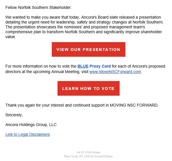 As a reminder, Ancora is seeking to elect seven highly qualified and independent director candidates to the Company’s Board of Directors at the 2024 Annual Meeting of Shareholders scheduled for May 9, 2024. For information on how to vote for Ancora’s slate of nominees on the BLUE Proxy Card, visit www.MoveNSCForward.com.