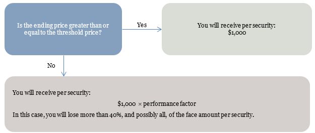 maturity if, and only if, the ending price is greater than or equal to the threshold price. If the ending price is less than the threshold price, you will lose more than 40%, and possibly all, of