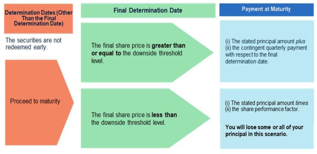 The securities are not automatically redeemed prior to maturity, and the final stock price is greater than or equal to the downside threshold level. ■ The payment due at maturity will be (i) the stated principal amount plus (ii) the contingent quarterly payment with respect to the final determination date. ■ Investors will not participate in any appreciation of the underlying stock from the initial stock price. |