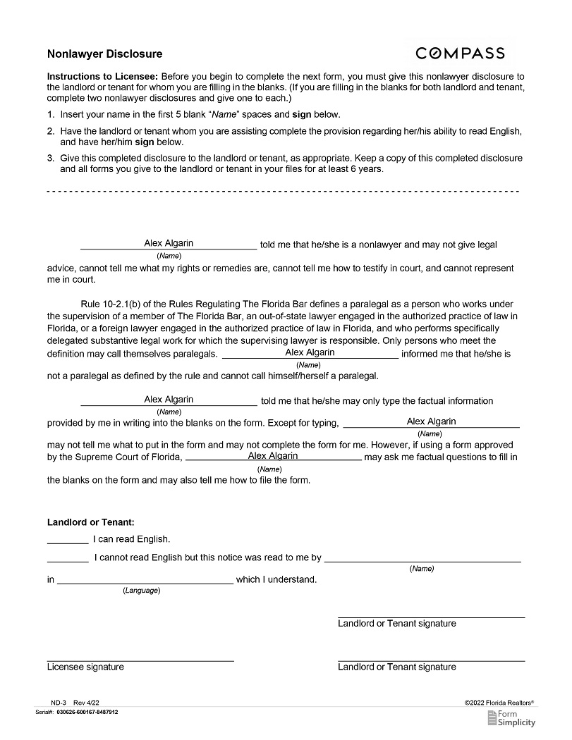 ND - 3 Rev 4/22 ©2022 Florida Realtors ® Nonlawyer Disclosure Instructions to Licensee : Before you begin to complete the next form, you must give this nonlawyer disclosure to the landlord or tenant for whom you are filling in the blanks . (If you are filling in the blanks for both landlord and tenant, complete two nonlawyer disclosures and give one to each . ) 1. Insert your name in the first 5 blank ” Name ” spaces and sign below . 2. Have the landlord or tenant whom you are assisting complete the provision regarding her/his ability to read English, and have her/him sign below. 3. Give this completed disclosure to the landlord or tenant, as appropriate. Keep a copy of this completed disclosure and all forms you give to the landlord or tenant in your files for at least 6 years. - - - - - - - - - - - - - - - - - - - - - - - - - - - - - - - - - - - - - - - - - - - - - - - - - - - - - - - - - - - - - - - - - - - - - - - - - - - - - - - - - - - - Alex Algarin told me that he/she is a nonlawyer and may not give legal ( Name ) advice, cannot tell me what my rights or remedies are, cannot tell me how to testify in court, and cannot represent me in court. Rule 10 - 2.1(b) of the Rules Regulating The Florida Bar defines a paralegal as a person who works under the supervision of a member of The Florida Bar, an out - of - state lawyer engaged in the authorized practice of law in Florida, or a foreign lawyer engaged in the authorized practice of law in Florida, and who performs specifically delegated substantive legal work for which the supervising lawyer is responsible. Only persons who meet the Alex Algarin definition may call themselves paralegals. informed me that he/she is ( Name ) not a paralegal as defined by the rule and cannot call himself/herself a paralegal. Alex Algarin told me that he/she may only type the factual information ( Name ) provided by me in writing into the blanks on the form. Except for typing, Alex Algarin ( Name ) may not tell me what to put in the form and may not complete the form for me. However, if using a form approved by the Supreme Court of Florida, Alex Algarin may ask me factual questions to fill in ( Name ) the blanks on the form and may also tell me how to file the form. Landlord or Tenant: I can read English. I cannot read English but this notice was read to me by ( Name) in which I understand. ( Language ) Landlord or Tenant signature Licensee signature Landlord or Tenant signature Serial#: 030626 - 600167 - 8487912