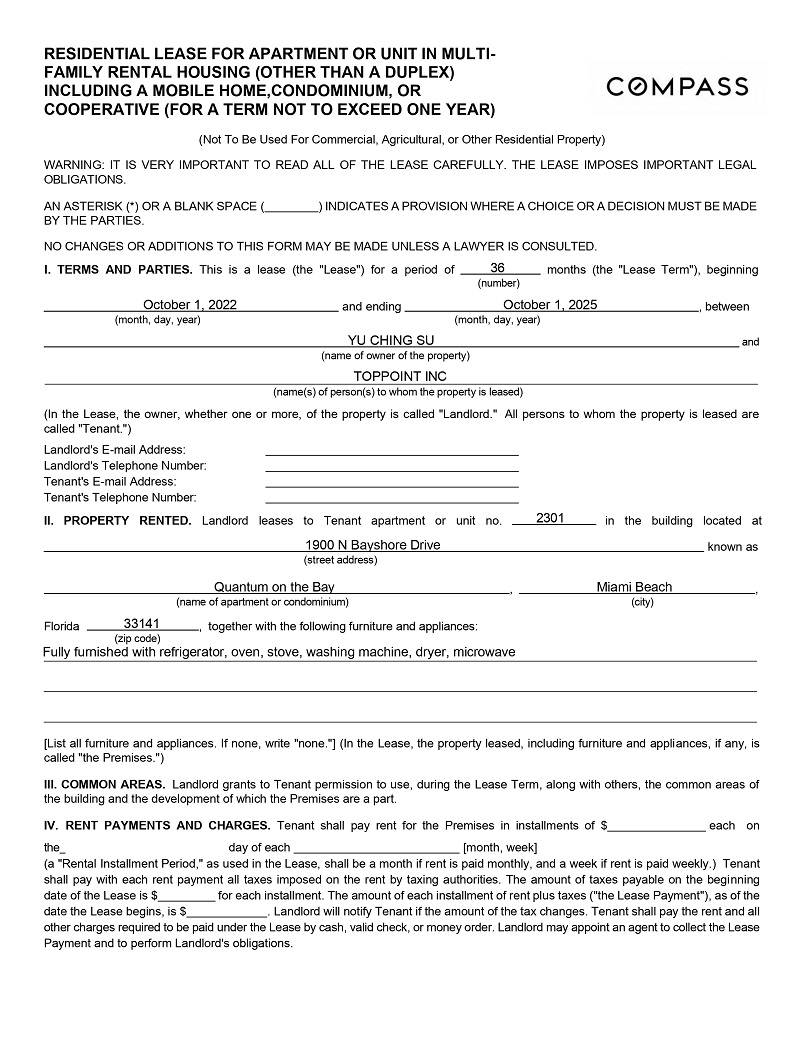 RESIDENTIAL LEASE FOR APARTMENT OR UNIT IN MULTI - FAMILY RENTAL HOUSING (OTHER THAN A DUPLEX) INCLUDING A MOBILE HOME,CONDOMINIUM, OR COOPERATIVE (FOR A TERM NOT TO EXCEED ONE YEAR) (Not To Be Used For Commercial, Agricultural, or Other Residential Property) WARNING: IT IS VERY IMPORTANT TO READ ALL OF THE LEASE CAREFULLY. THE LEASE IMPOSES IMPORTANT LEGAL OBLIGATIONS. AN ASTERISK (*) OR A BLANK SPA C E ( ) INDICATES A PR O VISI ON WHERE A C H O ICE O R A DE CISI ON M UST B E M ADE BY THE PARTIES. NO CHANGES OR ADDITIONS TO THIS FORM MAY BE MADE UNLESS A LAWYER IS CONSULTED. I. TERMS AND PARTIES. This is a lease (the “Lease”) for a period of 36 months (the “Lease Term”), beginning (number) October 1, 2022 and ending October 1, 2025 , between (month, day, year) (month, day, year) Y U CH I NG S U and (name of owner of the property) TOPPOINT INC (name(s) of person(s) to whom the property is leased) (In the Lease, the owner, whether one or more, of the property is called “Landlord.” All persons to whom the property is leased are called “Tenant.”) Landlord’s E - mail Address: Landlord’s Telephone Number: Tenant’s E - mail Address: Tenant’s Telephone Number: II. PROPERTY RENTED. Landlord 2301 in leases to Tenant apartment or unit no. the building located at 1900 N Bayshore Drive known as (street address) Quantum on the Bay (name of apartment or condominium) Florida 33141 , together with the following furniture and appliances: , M i a mi B ea c h , (city) ( zip c ode ) Fully furnished with refrigerator, oven, stove, washing machine, dryer, microwave [List all furniture and appliances . If none, write “none . “] (In the Lease, the property leased, including furniture and appliances, if any, is called “the Premises . “) III. COMMON AREAS . Landlord grants to Tenant permission to use, during the Lease Term, along with others, the common areas of the building and the development of which the Premises are a part . IV. RENT PAYMENTS AND CHARGES . Tenant shall pay rent for the Premises in installments of $ each on the day of each [month, week] (a “Rental Installment Period,” as used in the Lease, shall be a month if rent is paid monthly, and a week if rent is paid weekly . ) Tenant shall pay with each rent payment all taxes imposed on the rent by taxing authorities . The amount of taxes payable on the beginning date of the Lease is $ for each installment . The amount of each installment of rent plus taxes (“the Lease Payment”), as of the date the Lease begins, is $ . Landlord will notify Tenant if the amount of the tax changes . Tenant shall pay the rent and all other charges required to be paid under the Lease by cash, valid check, or money order . Landlord may appoint an agent to collect the Lease Payment and to perform Landlord’s obligations . Tenant ( ) ( ) and Landlord ( ) ( ) acknowledge receipt of a copy of this page, which is Page 1 of 18 . RLAUCC - 1x Rev 7/16 Approved on April 15, 2010, by the Supreme Court of Florida, for use under rule 10 - 2.1(a) of the Rules Regulating the Florida Bar. Serial#: 030626 - 600167 - 8487912