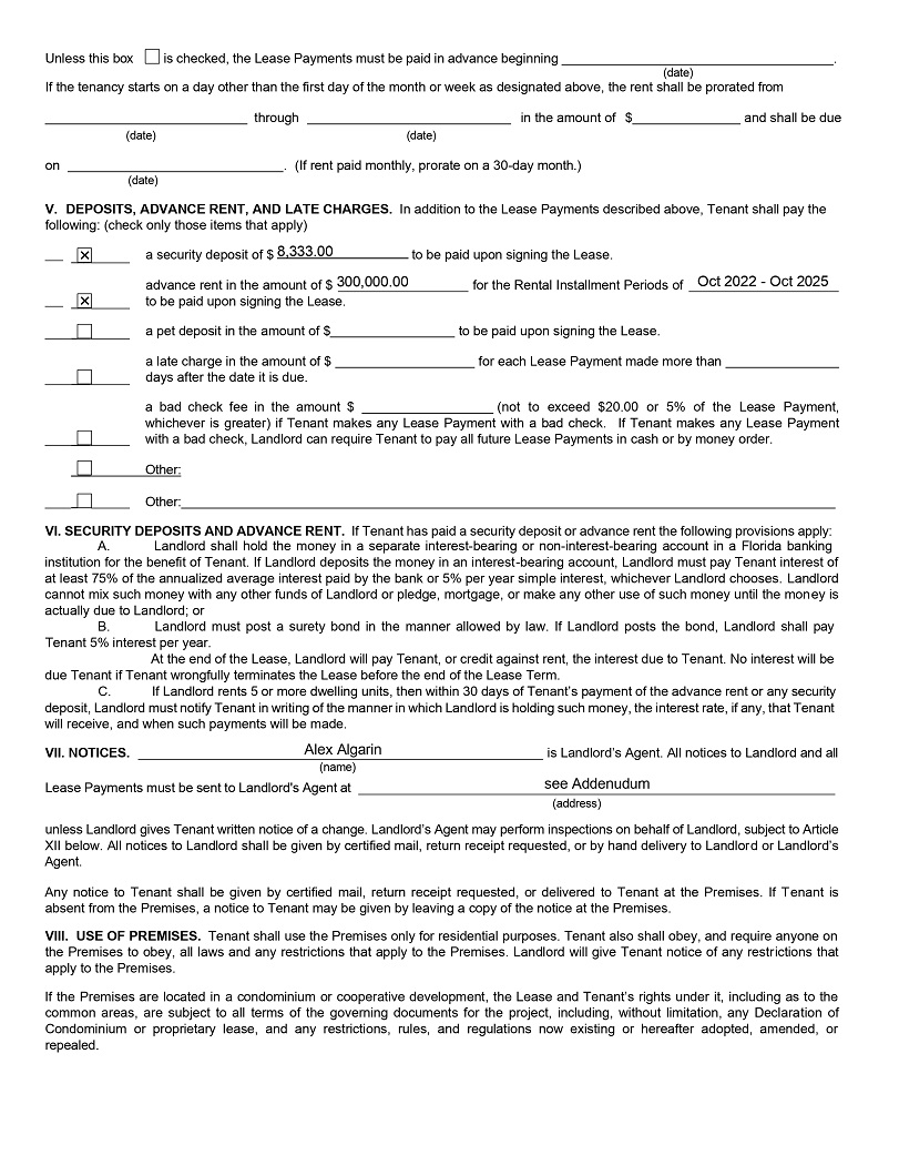 _ _ _ _ _ _ _ _ _ _ _ _ _ _ _ _ _ _ _ _ _ Other : Tenant ( ) ( ) and Landlord ( ) ( ) acknowledge receipt of a copy of this page, which is Page 2 of 18. RLAUCC - 1x Rev 7/16 Approved on April 15, 2010, by the Supreme Court of Florida, for use under rule 10 - 2.1(a) of the Rules Regulating the Florida Bar. Serial#: 030626 - 600167 - 8487912 a security deposit of $ 8,333.00 to be paid upon signing the Lease. Unless this box is c h e ck e d , t he L ea s e P a y m e n ts m u s t be pa i d in a d v a n c e b e gin n ing . (date) If the tenancy starts on a day other than the first day of the month or week as designated above, the rent shall be prorated from through in the amount of $ and shall be due (date) (date) on . (If rent paid monthly, prorate on a 30 - day month.) (date) V. DEPOSITS, ADVANCE RENT, AND LATE CHARGES. In addition to the Lease Payments described above, Tenant shall pay the following: (check only those items that apply) advance rent in the amount of $ 300,000.00 to be paid upon signing the Lease. for the Rental Installment Periods of Oct 2022 - Oct 2025 a pet deposit in the amount of $ to be paid upon signing the Lease. a late charge in the amount of $ for each Lease Payment made more than days after the date it is due. a bad check fee in the amount $ (not to exceed $ 20 . 00 or 5 % of the Lease Payment, whichever is greater) if Tenant makes any Lease Payment with a bad check . If Tenant makes any Lease Payment with a bad check, Landlord can require Tenant to pay all future Lease Payments in cash or by money order . Other: VI. SECURITY DEPOSITS AND ADVANCE RENT. If Tenant has paid a security deposit or advance rent the following provisions apply: A. Landlord shall hold the money in a separate interest - bearing or non - interest - bearing account in a Florida banking institution for the benefit of Tenant . If Landlord deposits the money in an interest - bearing account, Landlord must pay Tenant interest of at least 75 % of the annualized average interest paid by the bank or 5 % per year simple interest, whichever Landlord chooses . Landlord cannot mix such money with any other funds of Landlord or pledge, mortgage, or make any other use of such money until the money is actually due to Landlord ; or B. Landlord must post a surety bond in the manner allowed by law . If Landlord posts the bond, Landlord shall pay Tenant 5 % interest per year . At the end of the Lease, Landlord will pay Tenant, or credit against rent, the interest due to Tenant . No interest will be due Tenant if Tenant wrongfully terminates the Lease before the end of the Lease Term . C. If Landlord rents 5 or more dwelling units, then within 30 days of Tenant’s payment of the advance rent or any security deposit, Landlord must notify Tenant in writing of the manner in which Landlord is holding such money, the interest rate, if any, that Tenant will receive, and when such payments will be made . Alex Algarin (na m e ) VII. NOTICES. is Landlord’s Agent. All notices to Landlord and all Lease Payments must be sent to Landlord’s Agent at s ee A d d e n u d um (address) unless Landlord gives Tenant written notice of a change . Landlord’s Agent may perform inspections on behalf of Landlord, subject to Article XII below . All notices to Landlord shall be given by certified mail, return receipt requested, or by hand delivery to Landlord or Landlord’s Agent . Any notice to Tenant shall be given by certified mail, return receipt requested, or delivered to Tenant at the Premises . If Tenant is absent from the Premises, a notice to Tenant may be given by leaving a copy of the notice at the Premises . VIII . USE OF PREMISES . Tenant shall use the Premises only for residential purposes . Tenant also shall obey, and require anyone on the Premises to obey, all laws and any restrictions that apply to the Premises . Landlord will give Tenant notice of any restrictions that apply to the Premises . If the Premises are located in a condominium or cooperative development, the Lease and Tenant’s rights under it, including as to the common areas, are subject to all terms of the governing documents for the project, including, without limitation, any Declaration of Condominium or proprietary lease, and any restrictions, rules, and regulations now existing or hereafter adopted, amended, or repealed .