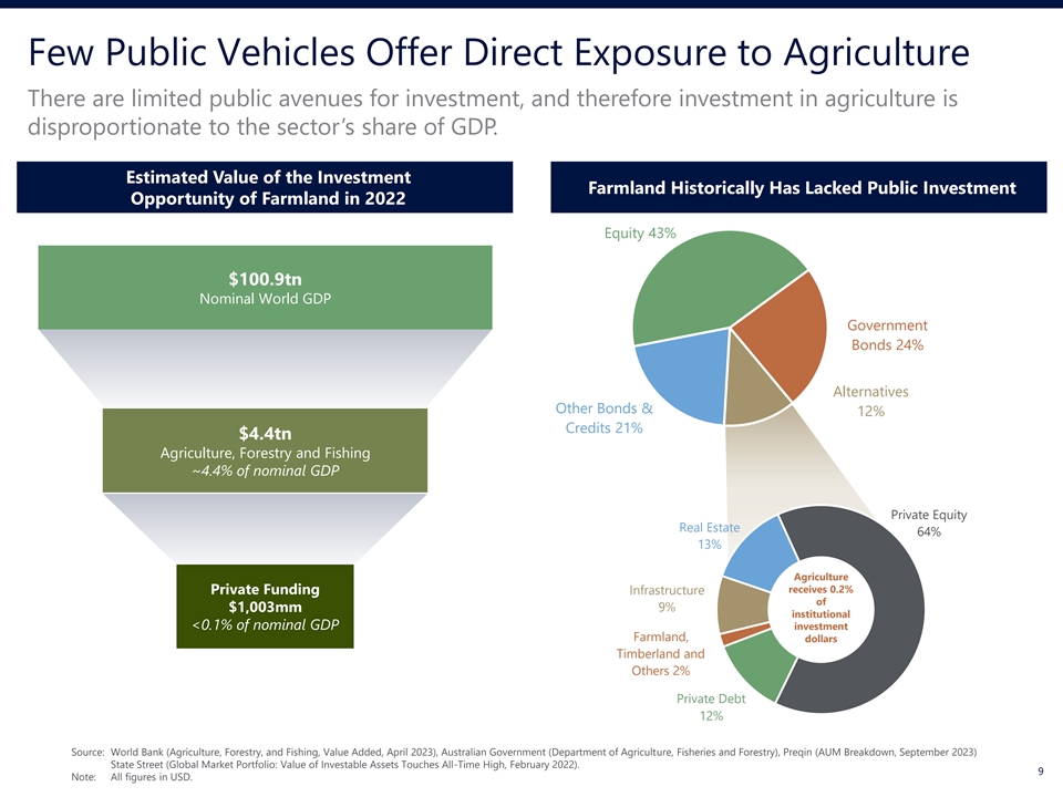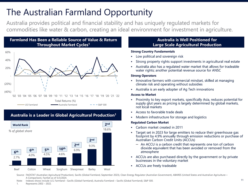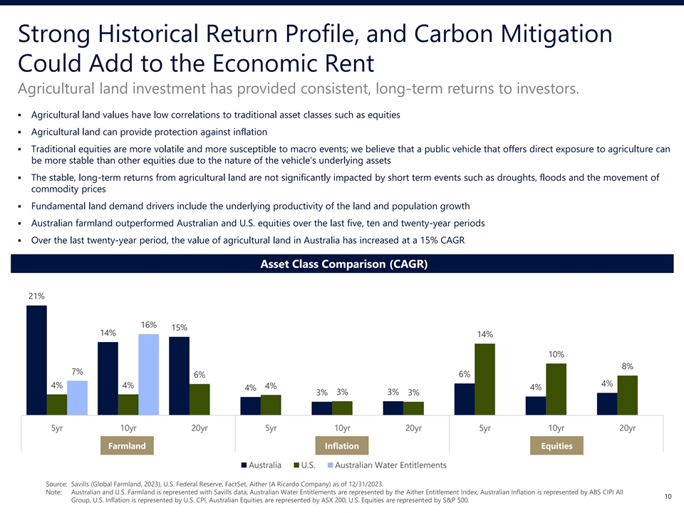 Strong Historical Return Profile, and Carbon Mitigation Could Add to the Economic Rent Agricultural land investment has provided consistent, long-term returns to investors. ▪ Agricultural land values have low correlations to traditional asset classes such as equities ▪ Agricultural land can provide protection against inflation ▪ Traditional equities are more volatile and more susceptible to macro events; we believe that a public vehicle that offers direct exposure to agriculture can be more stable than other equities due to the nature of the vehicle’s underlying assets ▪ The stable, long-term returns from agricultural land are not significantly impacted by short term events such as droughts, floods and the movement of commodity prices ▪ Fundamental land demand drivers include the underlying productivity of the land and population growth ▪ Australian farmland outperformed Australian and U.S. equities over the last five, ten and twenty-year periods ▪ Over the last twenty-year period, the value of agricultural land in Australia has increased at a 15% CAGR Asset Class Comparison (CAGR) 21% 16% 15% 14% 14% 10% 8% 7% 6% 6% 4% 4% 4% 4% 4% 4% 3% 3% 3% 3% 5yr 10yr 20yr 5yr 10yr 20yr 5yr 10yr 20yr Fa Far rm mlla an nd d Infla Inflat ti ion on Eq Equ uiti ity es Australia U.S. Australian Water Entitlements Source: Savills (Global Farmland, 2023), U.S. Federal Reserve, FactSet, Aither (A Ricardo Company) as of 12/31/2023. Note: Australian and U.S. Farmland is represented with Savills data, Australian Water Entitlements are represented by the Aither Entitlement Index, Australian Inflation is represented by ABS CIPI All 10 Group, U.S. Inflation is represented by U.S. CPI, Australian Equities are represented by ASX 200, U.S. Equities are represented by S&P 500.