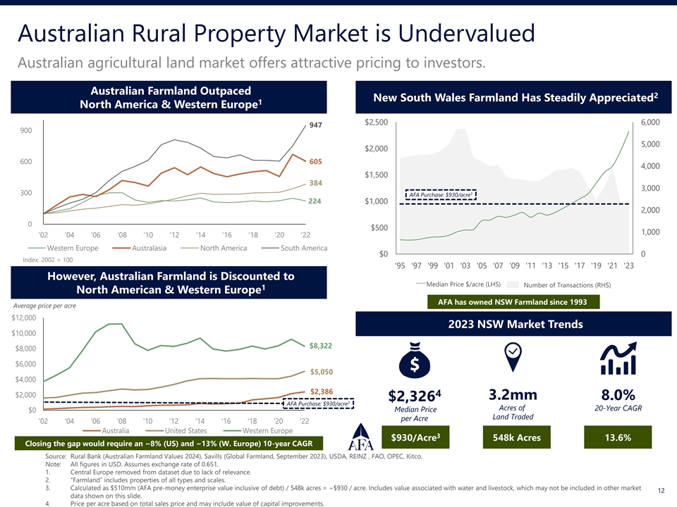 Australian Rural Property Market is Undervalued Australian agricultural land market offers attractive pricing to investors. Australian Farmland Outpaced 2 New South Wales Farmland Has Steadily Appreciated 1 North America & Western Europe $2,500 6,000 947 900 5,000 $2,000 600 605 4,000 $1,500 384 3,000 300 3 AFA Purchase: $930/acre 224 $1,000 2,000 0 $500 1,000 '02 '04 '06 '08 '10 '12 '14 '16 '18 '20 '22 Western Europe Australasia North America South America $0 0 Index: 2002 = 100 '95 '97 '99 '01 '03 '05 '07 '09 '11 '13 '15 '17 '19 '21 '23 However, Australian Farmland is Discounted to Median Price $/acre (LHS) Number of Transactions (RHS) 1 North American & Western Europe AFA has owned NSW Farmland since 1993 Average price per acre $12,000 2023 NSW Market Trends $10,000 $8,322 $8,000 $6,000 $5,050 $4,000 $2,386 $2,000 4 3.2mm 8.0% $2,326 3 AFA Purchase: $930/acre Acres of 20-Year CAGR Median Price $0 Land Traded per Acre '02 '04 '06 '08 '10 '12 '14 '16 '18 '20 '22 Australia United States Western Europe 3 $930/Acre 548k Acres 13.6% Closing the gap would require an ~8% (US) and ~13% (W. Europe) 10-year CAGR Source: Rural Bank (Australian Farmland Values 2024), Savills (Global Farmland, September 2023), USDA, REINZ , FAO, OPEC, Kitco. Note: All figures in USD. Assumes exchange rate of 0.651. 1. Central Europe removed from dataset due to lack of relevance. 2. “Farmland” includes properties of all types and scales. 3. Calculated as $510mm (AFA pre-money enterprise value inclusive of debt) / 548k acres = ~$930 / acre. Includes value associated with water and livestock, which may not be included in other market 12 data shown on this slide. 4. Price per acre based on total sales price and may include value of capital improvements.