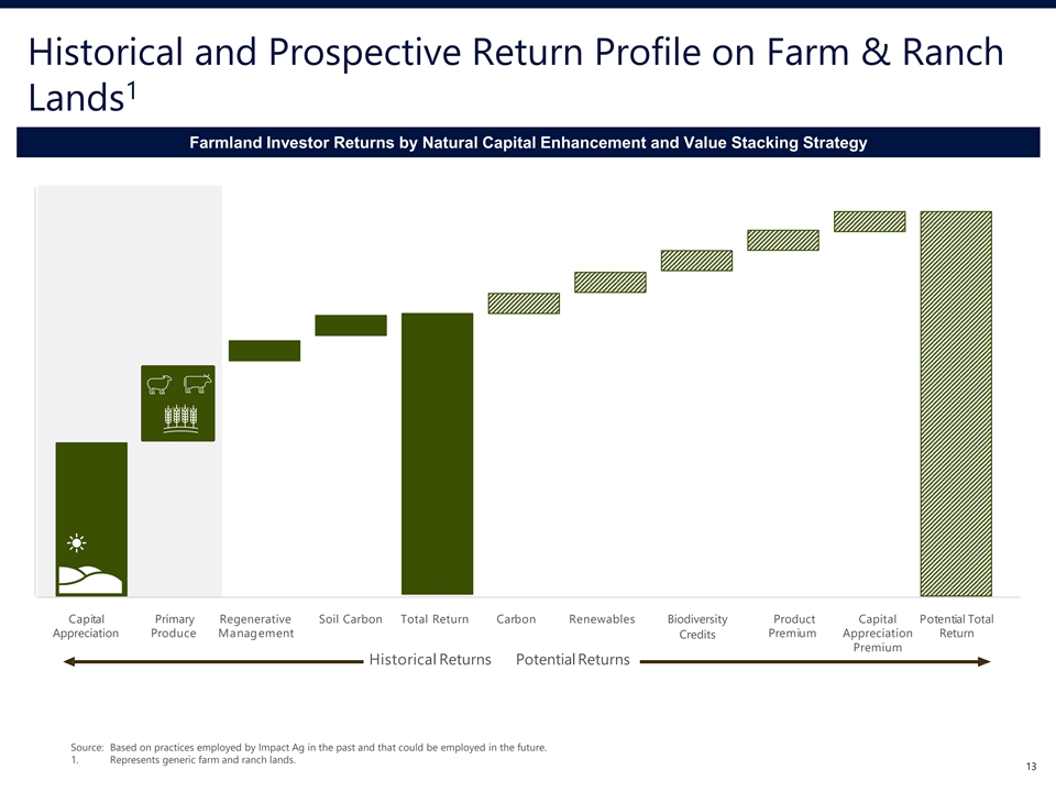Historical and Prospective Return Profile on Farm & Ranch 1 Lands Farmland Investor Returns by Natural Capital Enhancement and Value Stacking Strategy Capital Primary Regenerative Soil Carbon Total Return Carbon Renewables Biodiversity Product Capital Potential Total Appreciation Produce Management Premium Appreciation Return Credits Premium Historical Returns PotentialReturns Source: Based on practices employed by Impact Ag in the past and that could be employed in the future. 1. Represents generic farm and ranch lands. 13