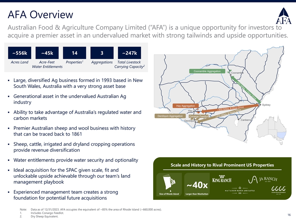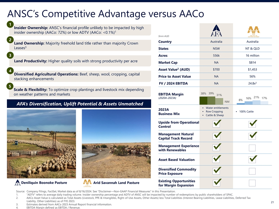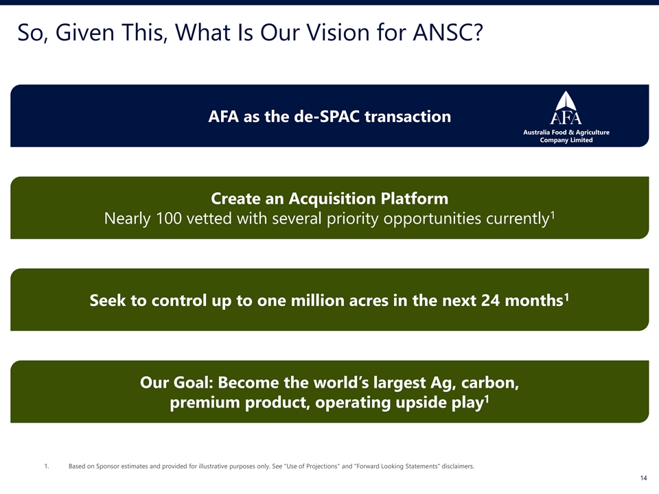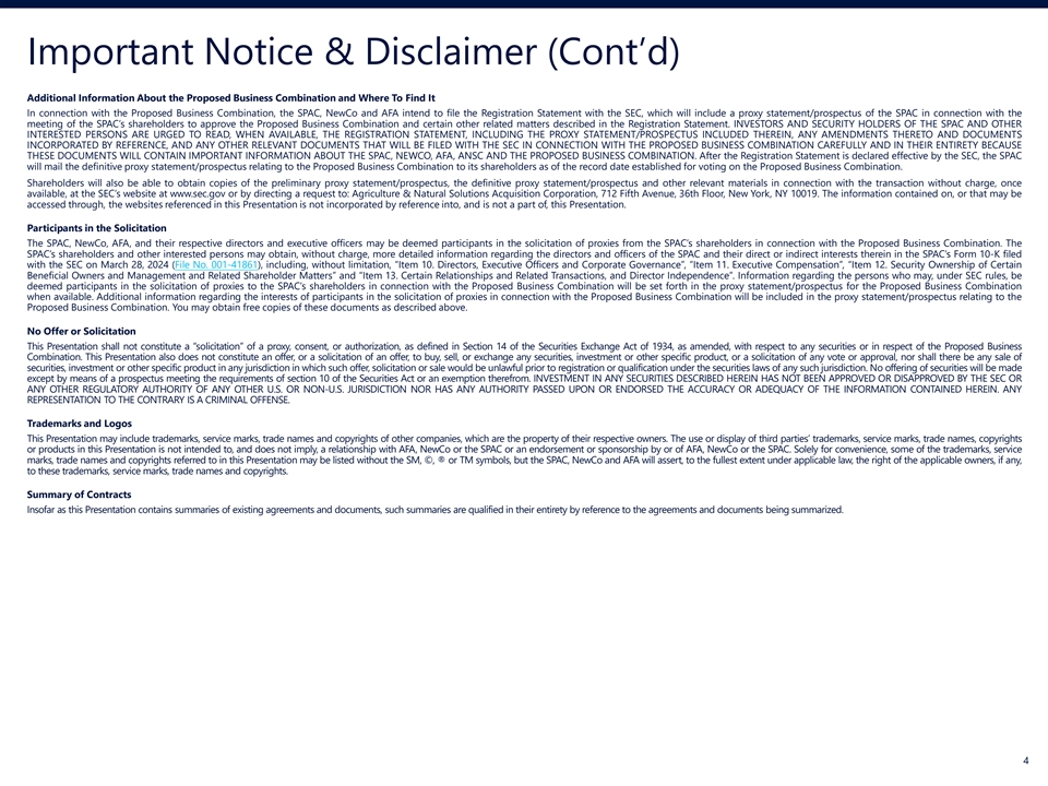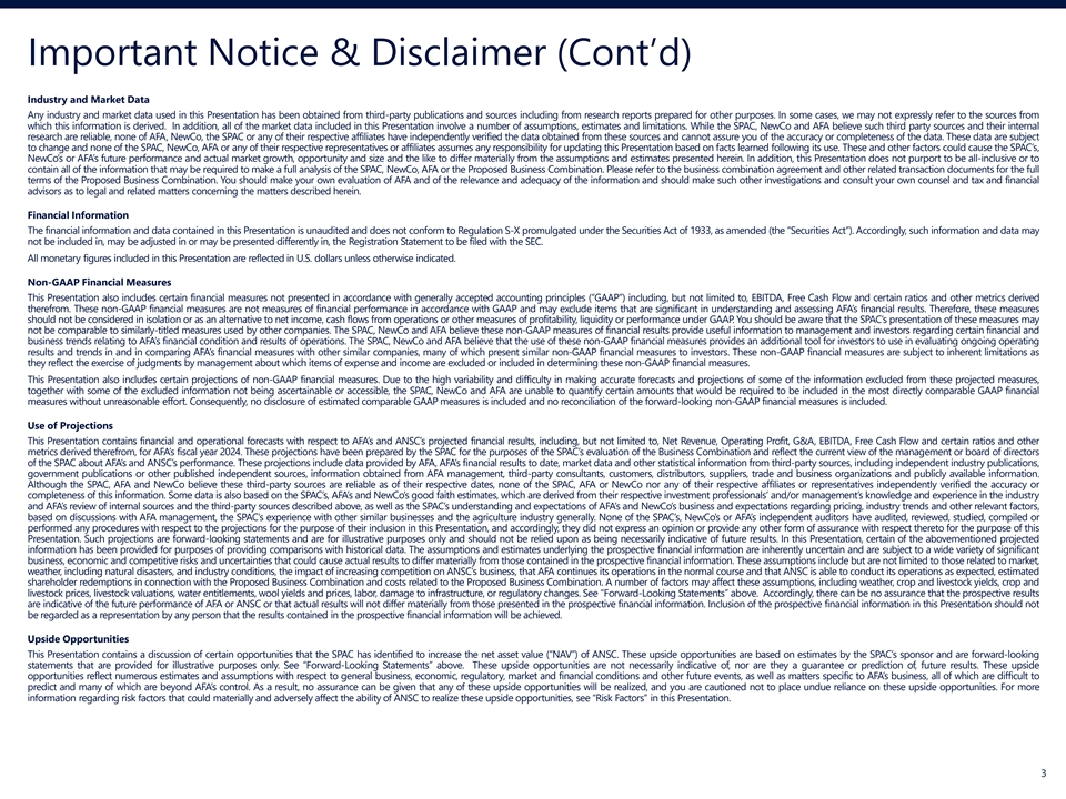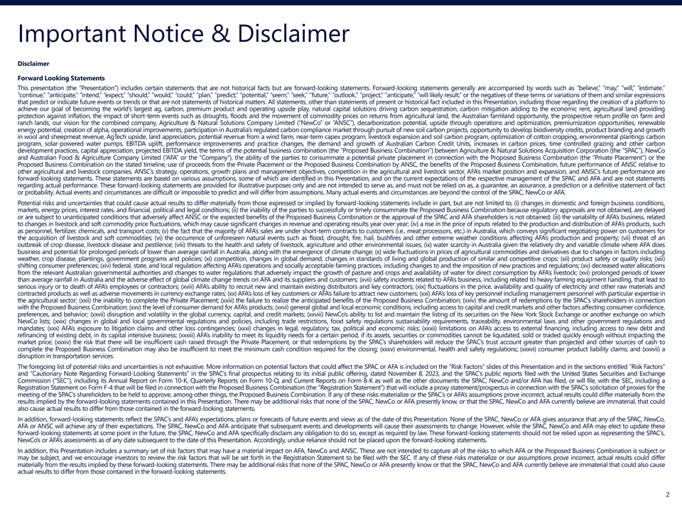 Important Notice & Disclaimer Disclaimer Forward Looking Statements This presentation (the “Presentation”) includes certain statements that are not historical facts but are forward-looking statements. Forward-looking statements generally are accompanied by words such as “believe,” “may,” “will,” “estimate,” “continue,” “anticipate,” “intend,” “expect,” “should,” “would,” “could,” “plan,” “predict,” “potential,” “seem,” “seek,” “future,” “outlook,” “project,” “anticipate,” “will likely result,” or the negatives of these terms or variations of them and similar expressions that predict or indicate future events or trends or that are not statements of historical matters. All statements, other than statements of present or historical fact included in this Presentation, including those regarding the creation of a platform to achieve our goal of becoming the world’s largest ag, carbon, premium product and operating upside play, natural capital solutions driving carbon sequestration, carbon mitigation adding to the economic rent, agricultural land providing protection against inflation, the impact of short-term events such as droughts, floods and the movement of commodity prices on returns from agricultural land, the Australian farmland opportunity, the prospective return profile on farm and ranch lands, our vision for the combined company, Agriculture & Natural Solutions Company Limited (“NewCo” or “ANSC”), decarbonization potential, upside through operations and optimization, premiumization opportunities, renewable energy potential, creation of alpha, operational improvements, participation in Australia’s regulated carbon compliance market through pursuit of new soil carbon projects, opportunity to develop biodiversity credits, product branding and growth in wool and sheepmeat revenue, AgTech upside, land appreciation, potential revenue from a wind farm, near-term capex program, livestock expansion and soil carbon program, optimization of cotton cropping, environmental plantings carbon program, solar-powered water pumps, EBITDA uplift, performance improvements and practice changes, the demand and growth of Australian Carbon Credit Units, increases in carbon prices, time controlled grazing and other carbon development practices, capital appreciation, projected EBITDA yield, the terms of the potential business combination (the “Proposed Business Combination”) between Agriculture & Natural Solutions Acquisition Corporation (the “SPAC”), NewCo and Australian Food & Agriculture Company Limited (“AFA” or the “Company”), the ability of the parties to consummate a potential private placement in connection with the Proposed Business Combination (the “Private Placement”) or the Proposed Business Combination on the stated timeline, use of proceeds from the Private Placement or the Proposed Business Combination by ANSC, the benefits of the Proposed Business Combination, future performance of ANSC relative to other agricultural and livestock companies, ANSC’s strategy, operations, growth plans and management objectives, competition in the agricultural and livestock sector, AFA’s market position and expansion, and ANSC’s future performance are forward-looking statements. These statements are based on various assumptions, some of which are identified in this Presentation, and on the current expectations of the respective management of the SPAC and AFA and are not statements regarding actual performance. These forward-looking statements are provided for illustrative purposes only and are not intended to serve as, and must not be relied on as, a guarantee, an assurance, a prediction or a definitive statement of fact or probability. Actual events and circumstances are difficult or impossible to predict and will differ from assumptions. Many actual events and circumstances are beyond the control of the SPAC, NewCo or AFA. Potential risks and uncertainties that could cause actual results to differ materially from those expressed or implied by forward-looking statements include in part, but are not limited to, (i) changes in domestic and foreign business conditions, markets, energy prices, interest rates, and financial, political and legal conditions; (ii) the inability of the parties to successfully or timely consummate the Proposed Business Combination because regulatory approvals are not obtained, are delayed or are subject to unanticipated conditions that adversely affect ANSC or the expected benefits of the Proposed Business Combination or the approval of the SPAC and AFA shareholders is not obtained; (iii) the variability of AFA’s business, related to changes in livestock and soft commodity price fluctuations, which may cause significant changes in revenue and operating results year over year; (iv) a rise in the price of inputs related to the production and distribution of AFA’s products, such as personnel, fertilizer, chemicals, and transport costs; (v) the fact that the majority of AFA’s sales are under short-term contracts to customers (i.e., meat processors, etc.) in Australia, which conveys significant negotiating power on customers for the acquisition of livestock and soft commodities; (vi) the occurrence of unforeseen natural events such as flood, drought, fire, hail, bushfires and other extreme weather conditions affecting AFA’s production and property; (vii) threat of an outbreak of crop disease, livestock disease and pestilence; (viii) threats to the health and safety of livestock, agriculture and other environmental issues; (ix) water scarcity in Australia given the relatively dry and variable climate where AFA does business and potential for prolonged periods of lower than average rainfall in Australia, along with the emergence of climate change; (x) wide fluctuations in prices of agricultural commodities and derivatives due to changes in factors including weather,