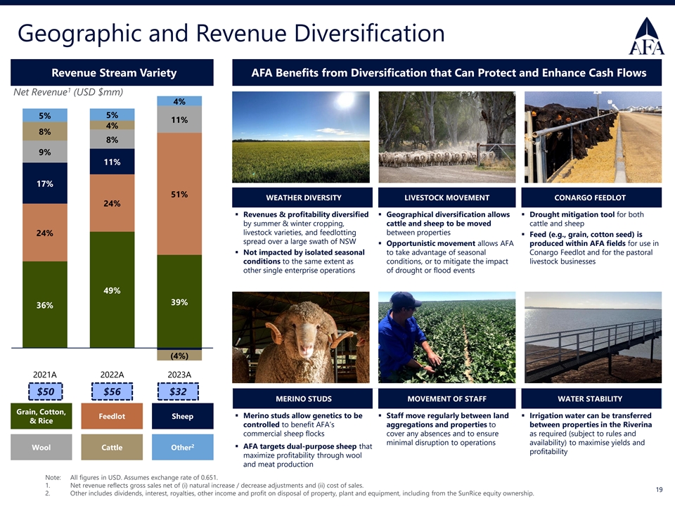 Premier Asset Base AFA’s aggregations are strategically located in the NSW Riverina and North West Slopes and Plains regions, which are known for their grazing and cropping production, as well as their proximity to infrastructure and processing facilities. Hay Coonamble Deniliquin Deniliquin Hay Coonamble Freehold Land Area with 1 Diverse Revenue Sources Grazing Cropping (Dryland) Cropping (Irrigated) 295,125 acres 140,541 acres 112,092 acres Water Entitlements 15,919 acre-feet 29,087 acre-feet N/A 48 (20 of which are associated with 9 9 2 Employees the Conargo Feedlot) Wheat, Barley, Canola, Wheat, Barley, Oats, Corn, Wheat, Barley, Chickpeas, Crop Types Oats, Lupins, Rice Cotton, Rice Faba Beans, Canola, Mung Beans Number of Properties in 3 7 5 2 Aggregation 4 ~95,000 ~16,000 ~12,000 ~19,000 ~87k Commercial Merino Sheep Stud Merino Sheep SCU Capacity Feedlot Commercial Beef Cattle Row Crop Acres Including ~80,000 ewes Including ~10,500 ewes including ~3,000 Hereford including ~24k and Angus cows irrigated acres Note: Data as of 12/31/2023 1. Does not include ~7,771 acres of Crown/other land. 2. Employees as of April 2024. 18 3. Includes Conargo Feedlot. 4. Includes feedlot cattle.