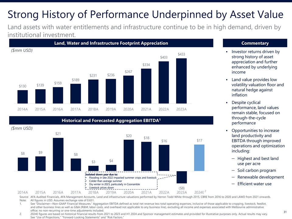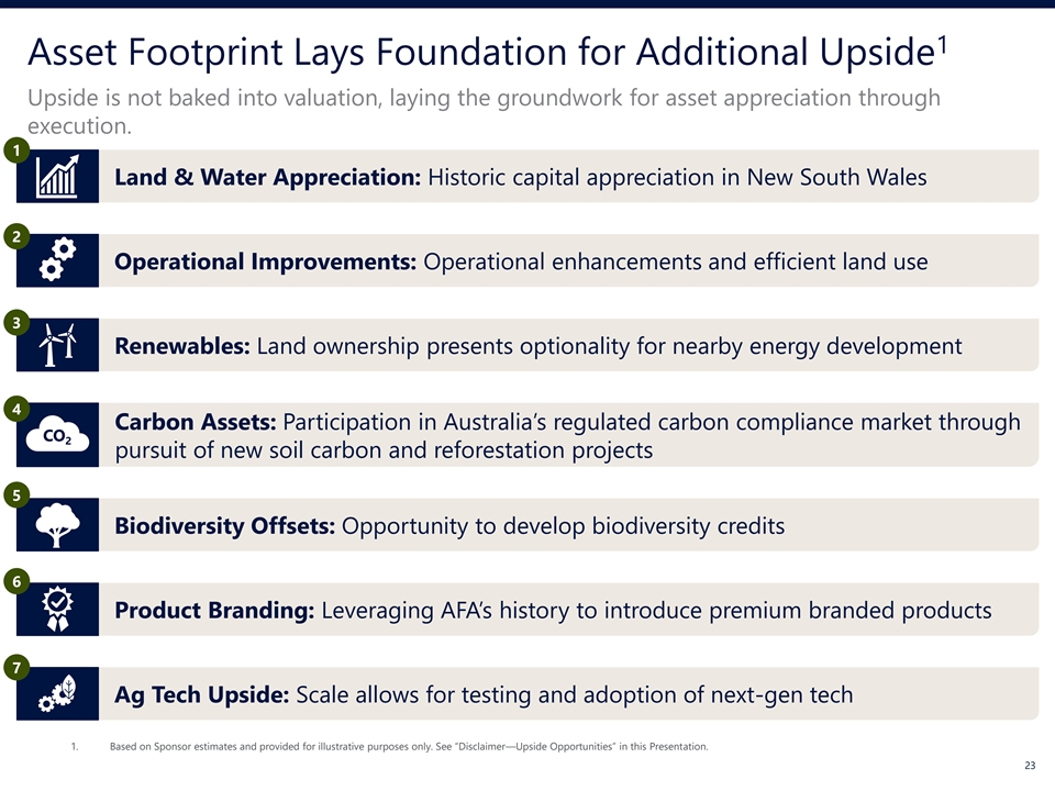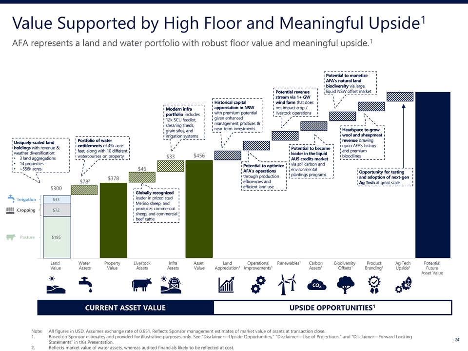 1 Asset Footprint Lays Foundation for Additional Upside Upside is not baked into valuation, laying the groundwork for asset appreciation through execution. 1 Land & Water Appreciation: Historic capital appreciation in New South Wales 2 Operational Improvements: Operational enhancements and efficient land use 3 Renewables: Land ownership presents optionality for nearby energy development 4 Carbon Assets: Participation in Australia’s regulated carbon compliance market through pursuit of new soil carbon and reforestation projects 5 Biodiversity Offsets: Opportunity to develop biodiversity credits 6 Product Branding: Leveraging AFA’s history to introduce premium branded products 7 Ag Tech Upside: Scale allows for testing and adoption of next-gen tech 1. Based on Sponsor estimates and provided for illustrative purposes only. See “Disclaimer—Upside Opportunities” in this Presentation. 23
