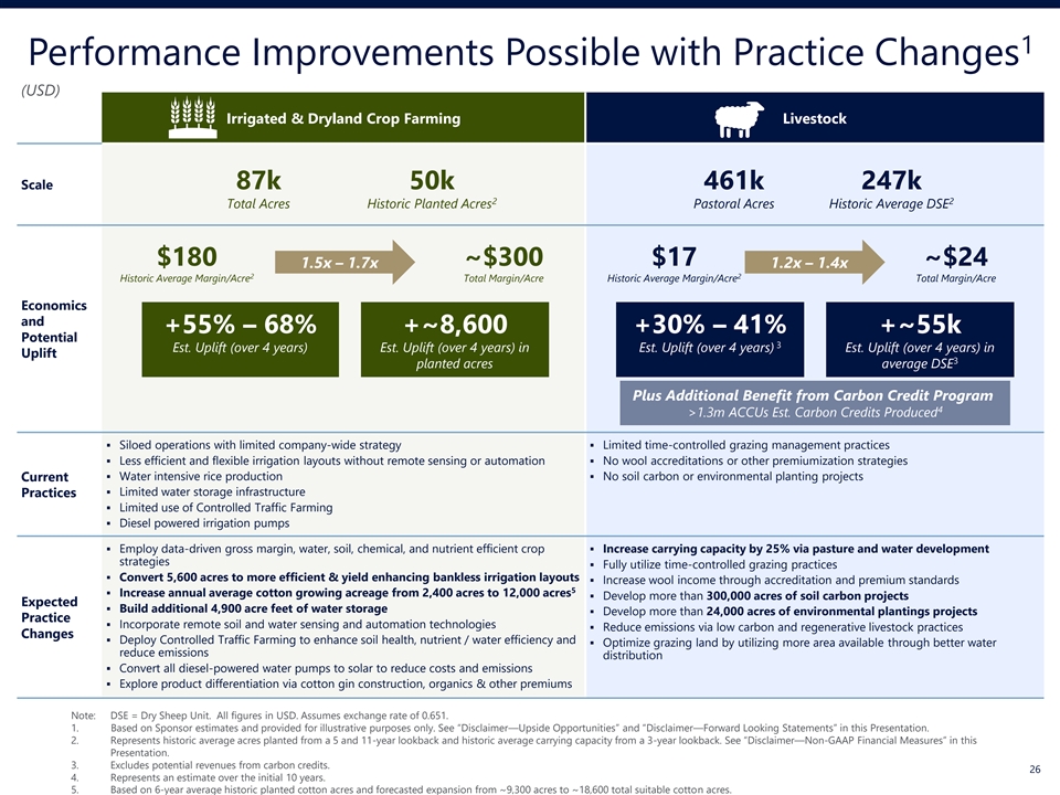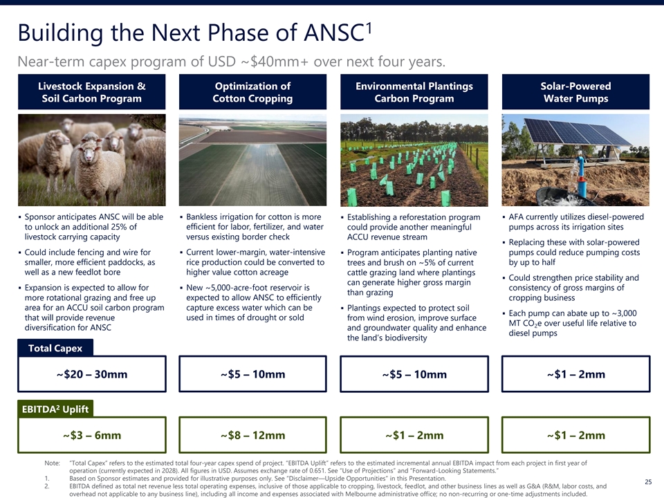 1 Building the Next Phase of ANSC Near-term capex program of USD ~$40mm+ over next four years. Livestock Expansion & Optimization of Environmental Plantings Solar-Powered Soil Carbon Program Cotton Cropping Carbon Program Water Pumps ▪ Sponsor anticipates ANSC will be able ▪ Bankless irrigation for cotton is more ▪ AFA currently utilizes diesel-powered ▪ Establishing a reforestation program to unlock an additional 25% of efficient for labor, fertilizer, and water could provide another meaningful pumps across its irrigation sites livestock carrying capacity versus existing border check ACCU revenue stream ▪ Replacing these with solar-powered ▪ Could include fencing and wire for ▪ Current lower-margin, water-intensive ▪ Program anticipates planting native pumps could reduce pumping costs rice production could be converted to smaller, more efficient paddocks, as trees and brush on ~5% of current by up to half well as a new feedlot bore higher value cotton acreage cattle grazing land where plantings ▪ Could strengthen price stability and can generate higher gross margin ▪ Expansion is expected to allow for ▪ New ~5,000-acre-foot reservoir is consistency of gross margins of than grazing more rotational grazing and free up expected to allow ANSC to efficiently cropping business area for an ACCU soil carbon program capture excess water which can be ▪ Plantings expected to protect soil ▪ Each pump can abate up to ~3,000 used in times of drought or sold that will provide revenue from wind erosion, improve surface MT CO e over useful life relative to 2 diversification for ANSC and groundwater quality and enhance diesel pumps the land’s biodiversity Total Capex ~$20 – 30mm ~$5 – 10mm ~$5 – 10mm ~$1 – 2mm 2 EBITDA Uplift ~$3 – 6mm ~$8 – 12mm ~$1 – 2mm ~$1 – 2mm Note: “Total Capex” refers to the estimated total four-year capex spend of project. “EBITDA Uplift” refers to the estimated incremental annual EBITDA impact from each project in first year of operation (currently expected in 2028). All figures in USD. Assumes exchange rate of 0.651. See “Use of Projections” and “Forward-Looking Statements.” 1. Based on Sponsor estimates and provided for illustrative purposes only. See “Disclaimer—Upside Opportunities” in this Presentation. 25 2. EBITDA defined as total net revenue less total operating expenses, inclusive of those applicable to cropping, livestock, feedlot, and other business lines as well as G&A (R&M, labor costs, and overhead not applicable to any business line), including all income and expenses associated with Melbourne administrative office; no non-recurring or one-time adjustments included.