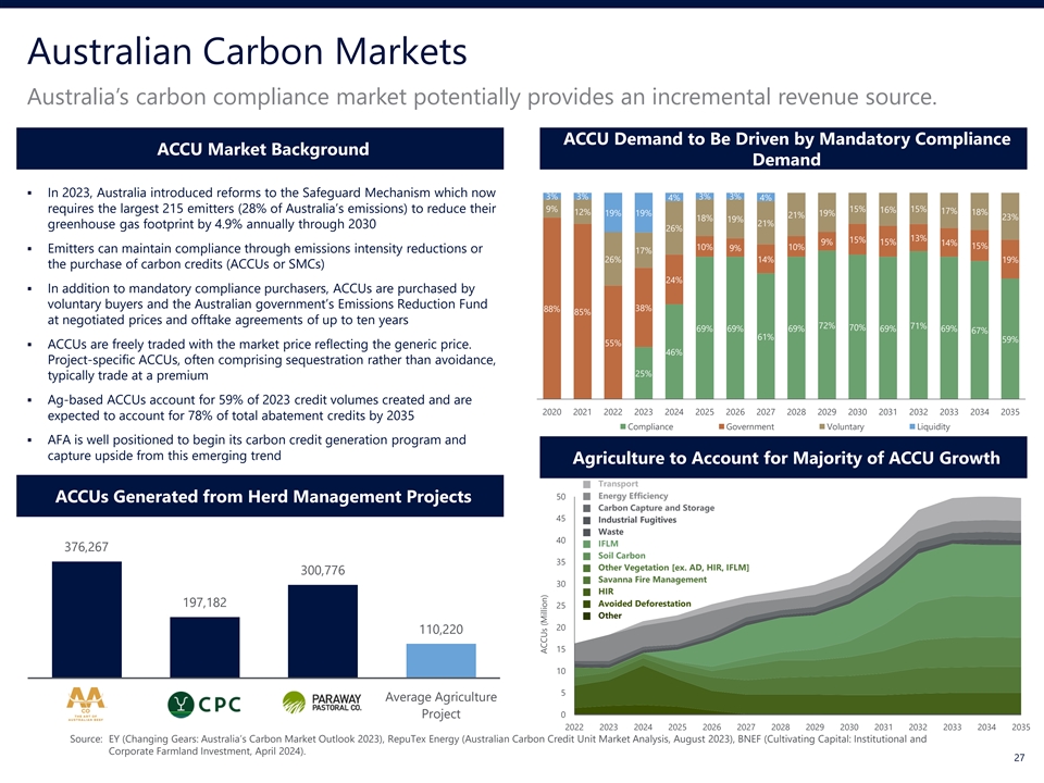 1 Performance Improvements Possible with Practice Changes (USD) Irrigated & Dryland Crop Farming Livestock Scale 87k 50k 461k 247k 2 2 Total Acres Historic Planted Acres Pastoral Acres Historic Average DSE $180 ~$300 $17 ~$24 1.5x – 1.7x 1.2x – 1.4x 2 2 Historic Average Margin/Acre Total Margin/Acre Historic Average Margin/Acre Total Margin/Acre Economics and +55% – 68% +~8,600 +30% – 41% +~55k Potential 3 Est. Uplift (over 4 years) Est. Uplift (over 4 years) in Est. Uplift (over 4 years) Est. Uplift (over 4 years) in Uplift 3 planted acres average DSE Plus Additional Benefit from Carbon Credit Program 4 >1.3m ACCUs Est. Carbon Credits Produced ▪ Siloed operations with limited company-wide strategy▪ Limited time-controlled grazing management practices ▪ Less efficient and flexible irrigation layouts without remote sensing or automation▪ No wool accreditations or other premiumization strategies ▪ Water intensive rice production▪ No soil carbon or environmental planting projects Current ▪ Limited water storage infrastructure Practices ▪ Limited use of Controlled Traffic Farming ▪ Diesel powered irrigation pumps ▪ Employ data-driven gross margin, water, soil, chemical, and nutrient efficient crop ▪ Increase carrying capacity by 25% via pasture and water development strategies ▪ Fully utilize time-controlled grazing practices ▪ Convert 5,600 acres to more efficient & yield enhancing bankless irrigation layouts ▪ Increase wool income through accreditation and premium standards 5 ▪ Increase annual average cotton growing acreage from 2,400 acres to 12,000 acres ▪ Develop more than 300,000 acres of soil carbon projects Expected ▪ Build additional 4,900 acre feet of water storage ▪ Develop more than 24,000 acres of environmental plantings projects Practice ▪ Incorporate remote soil and water sensing and automation technologies ▪ Reduce emissions via low carbon and regenerative livestock practices Changes ▪ Deploy Controlled Traffic Farming to enhance soil health, nutrient / water efficiency and ▪ Optimize grazing land by utilizing more area available through better water reduce emissions distribution ▪ Convert all diesel-powered water pumps to solar to reduce costs and emissions ▪ Explore product differentiation via cotton gin construction, organics & other premiums Note: DSE = Dry Sheep Unit. All figures in USD. Assumes exchange rate of 0.651. 1. Based on Sponsor estimates and provided for illustrative purposes only. See “Disclaimer—Upside Opportunities” and “Disclaimer—Forward Looking Statements” in this Presentation. 2. Represents historic average acres planted from a 5 and 11-year lookback and historic average carrying capacity from a 3-year lookback. See “Disclaimer—Non-GAAP Financial Measures” in this Presentation. 3. Excludes potential revenues from carbon credits. 26 4. Represents an estimate over the initial 10 years. 5. Based on 6-year average historic planted cotton acres and forecasted expansion from ~9,300 acres to ~18,600 total suitable cotton acres.