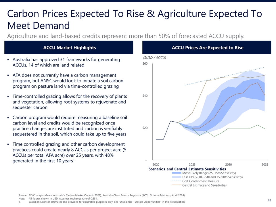 Carbon Prices Expected To Rise & Agriculture Expected To Meet Demand Agriculture and land-based credits represent more than 50% of forecasted ACCU supply. ACCU Market Highlights ACCU Prices Are Expected to Rise ($USD / ACCU) ▪ Australia has approved 31 frameworks for generating $60 ACCUs, 14 of which are land related ▪ AFA does not currently have a carbon management program, but ANSC would look to initiate a soil carbon program on pasture land via time-controlled grazing $40 ▪ Time-controlled grazing allows for the recovery of plants and vegetation, allowing root systems to rejuvenate and sequester carbon ▪ Carbon program would require measuring a baseline soil carbon level and credits would be recognized once $20 practice changes are instituted and carbon is verifiably sequestered in the soil, which could take up to five years ▪ Time controlled grazing and other carbon development practices could create nearly 8 ACCUs per project acre (5 ACCUs per total AFA acre) over 25 years, with 48% 1 -- generated in the first 10 years 2020 2025 2030 2035 Scenarios and Central Estimate Sensitivities Most Likely Range (25–75th Sensitivity) Less Likely (10–25th and 75–90th Sensitivity) Cost Containment Measure Central Estimate and Sensitivities Source: EY (Changing Gears: Australia’s Carbon Market Outlook 2023), Australia Clean Energy Regulator (ACCU Scheme Methods, April 2024). Note: All figures shown in USD. Assumes exchange rate of 0.651. 28 1. Based on Sponsor estimates and provided for illustrative purposes only. See “Disclaimer—Upside Opportunities” in this Presentation.