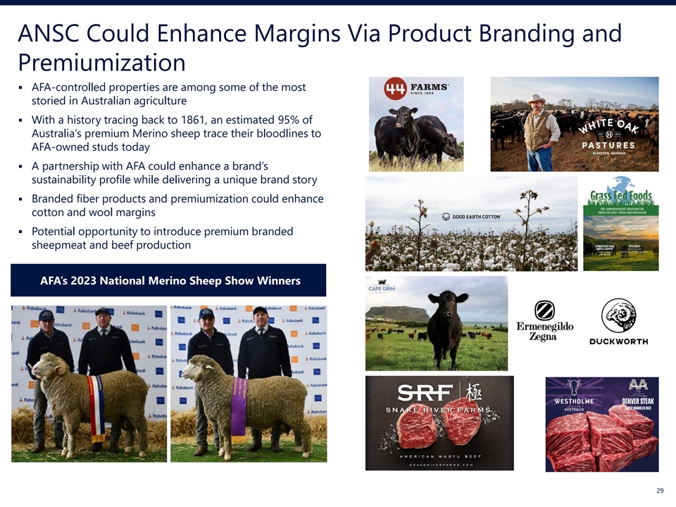 ANSC Could Enhance Margins Via Product Branding and Premiumization ▪ AFA-controlled properties are among some of the most storied in Australian agriculture ▪ With a history tracing back to 1861, an estimated 95% of Australia’s premium Merino sheep trace their bloodlines to AFA-owned studs today ▪ A partnership with AFA could enhance a brand’s sustainability profile while delivering a unique brand story ▪ Branded fiber products and premiumization could enhance cotton and wool margins ▪ Potential opportunity to introduce premium branded sheepmeat and beef production AFA’s 2023 National Merino Sheep Show Winners 29