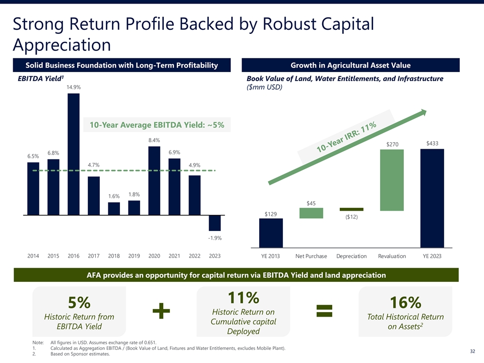 Strong History of Performance Underpinned by Asset Value Land assets with water entitlements and infrastructure continue to be in high demand, driven by institutional investment. Land, Water and Infrastructure Footprint Appreciation Commentary ($mm USD) ▪ Investor returns driven by $433 strong history of asset $403 appreciation and further $334 enhanced by underlying $267 income $236 $231 $189 ▪ Land value provides low $159 $139 volatility valuation floor and $130 natural hedge against inflation ▪ Despite cyclical performance, land values 2014A 2015A 2016A 2017A 2018A 2019A 2020A 2021A 2022A 2023A 2024A remain stable, focused on through-the-cycle 1 Historical and Forecasted Aggregation EBITDA performance ($mm USD) ▪ Opportunities to increase $21 $20 land productivity and $18 $17 $16 EBITDA through improved operations and optimization including: $9 $8 $8 ‒ Highest and best land $4 $3 use per acre ‒ Soil carbon program Isolated down year due to: ‒ Renewable development • Flooding in late 2022 impacted summer crops and livestock • Colder than average summer • Dry winter in 2023, particularly in Coonamble‒ Efficient water use • Livestock prices down ($8) 2 2014A 2015A 2016A 2017A 2018A 2019A 2020A 2021A 2022A 2023A 2024E A Source: AFA Audited Financials, AFA Management Accounts, Land and infrastructure valuations performed by Herron Todd White through 2015, CBRE from 2016 to 2020 and LAWD from 2021 onwards. Note: All figures in USD. Assumes exchange rate of 0.651. 1. See “Disclaimer—Non-GAAP Financial Measures.” Aggregation EBITDA defined as total net revenue less total operating expenses, inclusive of those applicable to cropping, livestock, feedlot, and other business lines as well as G&A (R&M, labor costs, and overhead not applicable to any business line), excluding all income and expenses associated with Melbourne administrative office; no non-recurring or one-time adjustments included. 31 2. 2024E figures are based on historical financial results from 2021 to 2023 and H1 2024 and Sponsor management estimates and provided for illustrative purposes only. Actual results may vary. See Use of Projections, Forward-Looking Statements and Risk Factors.“