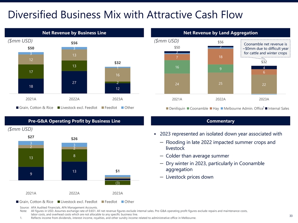Strong Return Profile Backed by Robust Capital Appreciation Solid Business Foundation with Long-Term Profitability Growth in Agricultural Asset Value 1 EBITDA Yield Book Value of Land, Water Entitlements, and Infrastructure 14.9% ($mm USD) 10-Year Average EBITDA Yield: ~5% 8.4% $433 $270 6.9% 6.8% 6.5% 4.7% 4.9% 1.8% 1.6% $45 $129 ($12) -1.9% 2014 2015 2016 2017 2018 2019 2020 2021 2022 2023 YE 2013 Net Purchase Depreciation Revaluation YE 2023 AFA provides an opportunity for capital return via EBITDA Yield and land appreciation 11% 5% 16% Historic Return on Historic Return from Total Historical Return Cumulative capital 2 EBITDA Yield on Assets Deployed Note: All figures in USD. Assumes exchange rate of 0.651. 1. Calculated as Aggregation EBITDA / (Book Value of Land, Fixtures and Water Entitlements, excludes Mobile Plant). 32 2. Based on Sponsor estimates.