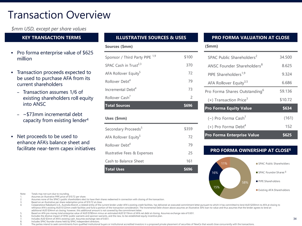 Transaction Overview $mm USD, except per share values KEY TRANSACTION TERMS ILLUSTRATIVE SOURCES & USES PRO FORMA VALUATION AT CLOSE Sources ($mm) ($mm) ▪ Pro forma enterprise value of $625 1,9 2 Sponsor / Third Party PIPE $100 34.500 SPAC Public Shareholders million 2,3 8 370 SPAC Cash in Trust 8.625 ANSC Founder Shareholders 5 ▪ Transaction proceeds expected to 1,9 72 AFA Rollover Equity PIPE Shareholders 9.324 be used to purchase AFA from its 4 79 3,5 Rollover Debt 6.686 AFA Rollover Equity current shareholders 4 Incremental Debt 73 6 59.136 Pro Forma Shares Outstanding ‒ Transaction assumes 1/6 of 7 2 Rollover Cash 3 existing shareholders roll equity (×) Transaction Price $10.72 into ANSC Total Sources $696 Pro Forma Equity Value $634 ‒ ~$73mm incremental debt 7 (161) Uses ($mm) (−) Pro Forma Cash 4 capacity from existing lender 4 (+) Pro Forma Debt 152 5 $359 Secondary Proceeds Pro Forma Enterprise Value $625 5 ▪ Net proceeds to be used to 72 AFA Rollover Equity enhance AFA’s balance sheet and 4 Rollover Debt 79 facilitate near-term capex initiatives 6 PRO FORMA OWNERSHIP AT CLOSE Illustrative Fees & Expenses 25 Cash to Balance Sheet 161 11% SPAC Public Shareholders Total Uses $696 8 SPAC Founder Shares 16% PIPE Shareholders 58% 15% Existing AFA Shareholders Note: Totals may not sum due to rounding. 1. Assumes an illustrative PIPE price of $10.72 per share. 2. Assumes none of the SPAC’s public shareholders elect to have their shares redeemed in connection with closing of the transaction. 3. Based on an illustrative per share redemption price of $10.72 at close. 4. Coöperatieve Rabobank U.A., Australia Branch, a related entity of the current lender under AFA’s existing credit facilities, has delivered an executed commitment letter pursuant to which it has committed to lend AUD $200mm to AFA at closing to refinance AFA’s existing AUD $122mm credit facilities and fund a portion of the transaction consideration. The Incremental Debt shown above assumes an illustrative 30% loan-to-value and thus assumes that the lender agrees to lend an additional AUD $34mm at closing; however, this additional amount is not covered by the commitment letter. 5. Based on AFA pre-money total enterprise value of AUD $780mm minus an estimated AUD $119mm of AFA net debt at closing. Assumes exchange rate of 0.651. 6. Excludes the dilutive impact of SPAC public warrants and sponsor warrants, and the new, to-be-established equity incentive plan. 7. Includes AUD $3mm of AFA’s existing cash. Assumes exchange rate of 0.651. 34 8. Includes SPAC founder shares held by SPAC independent directors. 9. The parties intend to seek commitments from qualified institutional buyers or institutional accredited investors in a proposed private placement of securities of NewCo that would close concurrently with the transactions.