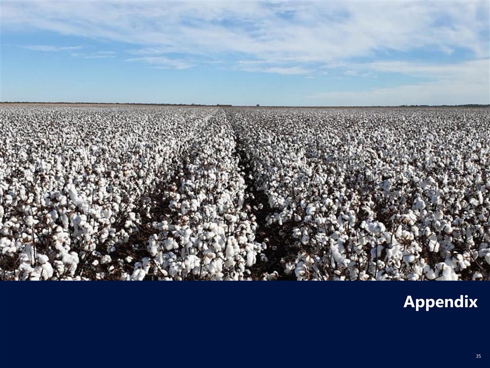 Diversified Business Mix with Attractive Cash Flow Net Revenue by Business Line Net Revenue by Land Aggregation ($mm USD) ($mm USD) $56 $56 Coonamble net revenue is 2 $50 $50 3 ~$0mm due to difficult year 2 for cattle and winter crops 3 13 18 7 12 $32 $32 13 16 4 1 9 17 6 16 27 2 25 24 22 18 12 2021A 2022A 2023A 2021A 2022A 2023A 1 Grain, Cotton & Rice Livestock excl. Feedlot Feedlot Other Deniliquin Coonamble Hay Melbourne Admin. Office Internal Sales Pre-G&A Operating Profit by Business Line Commentary ($mm USD) ▪ 2023 represented an isolated down year associated with $27 $26 ‒ Flooding in late 2022 impacted summer crops and 3 3 2 2 livestock 8 ‒ Colder than average summer 13 ‒ Dry winter in 2023, particularly in Coonamble aggregation 13 $1 9 ‒ Livestock prices down (3) 2021A 2022A 2023A Grain, Cotton & Rice Livestock excl. Feedlot Feedlot Other Source: AFA Audited Financials, AFA Management Accounts. Note: All figures in USD. Assumes exchange rate of 0.651. All net revenue figures exclude internal sales. Pre-G&A operating profit figures exclude repairs and maintenance costs, labor costs, and overhead costs which are not allocable to any specific business line. 33 1. Reflects income from dividends, interest income, royalties, and other sundry income related to administrative office in Melbourne.