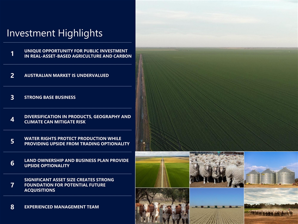 Investment Highlights UNIQUE OPPORTUNITY FOR PUBLIC INVESTMENT 1 IN REAL-ASSET-BASED AGRICULTURE AND CARBON AUSTRALIAN MARKET IS UNDERVALUED 2 STRONG BASE BUSINESS 3 DIVERSIFICATION IN PRODUCTS, GEOGRAPHY AND 4 CLIMATE CAN MITIGATE RISK WATER RIGHTS PROTECT PRODUCTION WHILE 5 PROVIDING UPSIDE FROM TRADING OPTIONALITY LAND OWNERSHIP AND BUSINESS PLAN PROVIDE 6 UPSIDE OPTIONALITY SIGNIFICANT ASSET SIZE CREATES STRONG FOUNDATION FOR POTENTIAL FUTURE 7 ACQUISITIONS EXPERIENCED MANAGEMENT TEAM 8