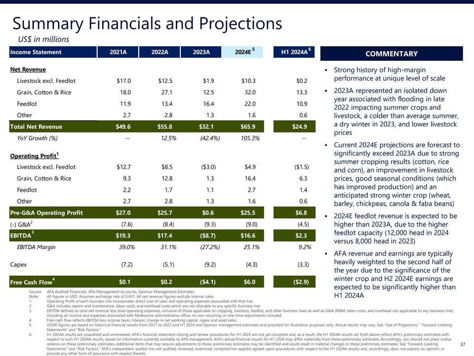 Summary Financials and Projections US$ in millions 5 6 4 Income Statement 2021A 2022A 2023A 2024E H1 2024A COMMENTARY Net Revenue ▪ Strong history of high-margin performance at unique level of scale Livestock excl. Feedlot $17.0 $12.5 $1.9 $10.3 $0.2 ▪ 2023A represented an isolated down Grain, Cotton & Rice 18.0 27.1 12.5 32.0 13.3 year associated with flooding in late Feedlot 11.9 13.4 16.4 22.0 10.9 2022 impacting summer crops and Other 2.7 2.8 1.3 1.6 0.6 livestock, a colder than average summer, a dry winter in 2023, and lower livestock Total Net Revenue $49.6 $55.8 $32.1 $65.9 $24.9 prices YoY Growth (%) -- 12.5% (42.4%) 105.3% -- ▪ Current 2024E projections are forecast to 1 significantly exceed 2023A due to strong Operating Profit summer cropping results (cotton, rice Livestock excl. Feedlot $12.7 $8.5 ($3.0) $4.9 ($1.5) and corn), an improvement in livestock Grain, Cotton & Rice 9.3 12.8 1.3 16.4 6.3 prices, good seasonal conditions (which has improved production) and an Feedlot 2.2 1.7 1.1 2.7 1.4 anticipated strong winter crop (wheat, Other 2.7 2.8 1.3 1.6 0.6 barley, chickpeas, canola & faba beans) Pre-G&A Operating Profit $27.0 $25.7 $0.6 $25.5 $6.8 ▪ 2024E feedlot revenue is expected to be 2 (7.6) (8.4) (9.3) (9.0) (4.5) (-) G&A higher than 2023A, due to the higher 3 feedlot capacity (12,000 head in 2024 EBITDA $19.3 $17.4 ($8.7) $16.6 $2.3 versus 8,000 head in 2023) EBITDA Margin 39.0% 31.1% (27.2%) 25.1% 9.2% ▪ AFA revenue and earnings are typically heavily weighted to the second half of Capex (7.2) (5.1) (9.2) (4.3) (3.3) the year due to the significance of the 4 winter crop and H2 2024E earnings are 3 $0.1 $0.2 ($4.1) $6.0 ($2.9) Free Cash Flow expected to be significantly higher than Source: AFA Audited Financials, AFA Management Accounts, Sponsor Management Estimates. Note: All figures in USD. Assumes exchange rate of 0.651. All net revenue figures exclude internal sales. H1 2024A 1. Operating Profit of each business line incorporates direct cost of sales and operating expenses associated with that line. 2. G&A includes repairs and maintenance, labor costs, and overhead costs which are not allocable to any specific business line. 3. EBITDA defined as total net revenue less total operating expenses, inclusive of those applicable to cropping, livestock, feedlot, and other business lines as well as G&A (R&M, labor costs, and overhead not applicable to any business line), including all income and expenses associated with Melbourne administrative office; no non-recurring or one-time adjustments included. 4. Free cash flow reflects EBITDA less income taxes, interest, change in net working capital, capex and asset sales. 5. 2024E figures are based on historical financial results from 2021 to 2023 and H1 2024 and Sponsor management estimates and provided for illustrative purposes only. Actual results may vary. See Use of Projections, Forward-Looking Statements and Risk Factors.“ 6. H1 2024A results are unaudited and unreviewed. AFA’s financial statement closing and review procedures for H1 2024 are not yet complete and, as a result, the H1 2024A results set forth above reflect AFA’s preliminary estimates with respect to such H1 2024A results, based on information currently available to AFA management. AFA’s actual financial results for H1 2024 may differ materially from these preliminary estimates. Accordingly, you should not place undue reliance on these preliminary estimates. Additional items that may require adjustments to these preliminary estimates may be identified and could result in material changes to these preliminary estimates. See “Forward-Looking 37 Statements” and “Risk Factors.” AFA’s independent auditor has not audited, reviewed, examined, compiled nor applied agreed-upon procedures with respect to the H1 2024A results and, accordingly, does not express an opinion or provide any other form of assurance with respect thereto.