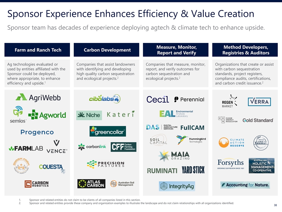 Sponsor Experience Enhances Efficiency & Value Creation Sponsor team has decades of experience deploying agtech & climate tech to enhance upside. Measure, Monitor, Method Developers, Farm and Ranch Tech Carbon Development Report and Verify Registries & Auditors Ag technologies evaluated or Companies that assist landowners Companies that measure, monitor, Organizations that create or assist used by entities affiliated with the with identifying and developing report, and verify outcomes for with carbon sequestration Sponsor could be deployed, high quality carbon sequestration carbon sequestration and standards, project registers, 2 2 where appropriate, to enhance and ecological projects. ecological projects. compliance audits, certifications, 1 2 efficiency and upside. and carbon credit issuance. 1. Sponsor and related entities do not claim to be clients of all companies listed in this section. 2. Sponsor and related entities provide these company and organization examples to illustrate the landscape and do not claim relationships with all organizations identified. 38