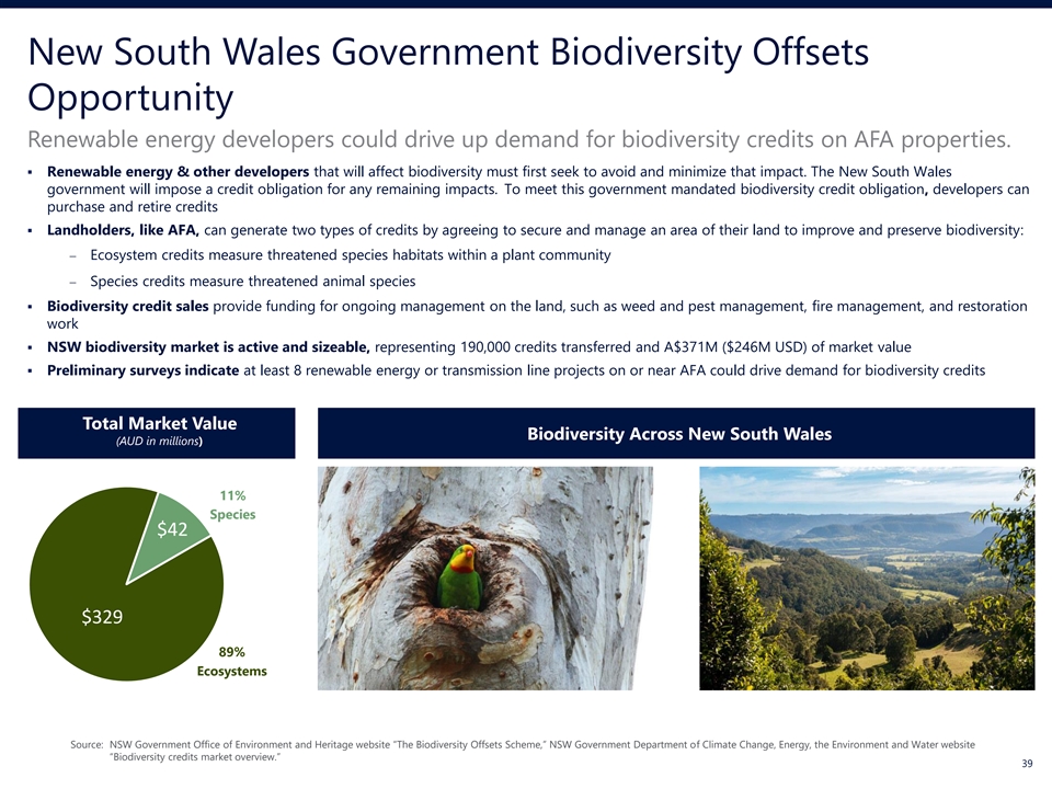 New South Wales Government Biodiversity Offsets Opportunity Renewable energy developers could drive up demand for biodiversity credits on AFA properties. ▪ Renewable energy & other developers that will affect biodiversity must first seek to avoid and minimize that impact. The New South Wales government will impose a credit obligation for any remaining impacts. To meet this government mandated biodiversity credit obligation, developers can purchase and retire credits ▪ Landholders, like AFA, can generate two types of credits by agreeing to secure and manage an area of their land to improve and preserve biodiversity: − Ecosystem credits measure threatened species habitats within a plant community − Species credits measure threatened animal species ▪ Biodiversity credit sales provide funding for ongoing management on the land, such as weed and pest management, fire management, and restoration work ▪ NSW biodiversity market is active and sizeable, representing 190,000 credits transferred and A$371M ($246M USD) of market value ▪ Preliminary surveys indicate at least 8 renewable energy or transmission line projects on or near AFA could drive demand for biodiversity credits Total Market Value Biodiversity Across New South Wales (AUD in millions) 11% Species $42 $329 89% Ecosystems Source: NSW Government Office of Environment and Heritage website “The Biodiversity Offsets Scheme,” NSW Government Department of Climate Change, Energy, the Environment and Water website “Biodiversity credits market overview.” 39