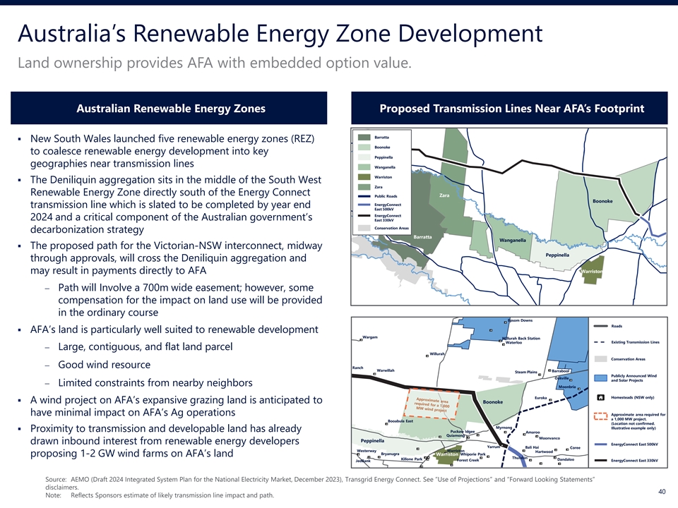 Australia’s Renewable Energy Zone Development Land ownership provides AFA with embedded option value. Australian Renewable Energy Zones Proposed Transmission Lines Near AFA’s Footprint Barratta ▪ New South Wales launched five renewable energy zones (REZ) Boonoke to coalesce renewable energy development into key Peppinella geographies near transmission lines Wanganella Warriston ▪ The Deniliquin aggregation sits in the middle of the South West Zara Renewable Energy Zone directly south of the Energy Connect Public Roads Zara Boonoke EnergyConnect transmission line which is slated to be completed by year end East 500kV EnergyConnect 2024 and a critical component of the Australian government’s East 330kV Conservation Areas decarbonization strategy Barratta Wanganella ▪ The proposed path for the Victorian-NSW interconnect, midway Peppinella through approvals, will cross the Deniliquin aggregation and Warriston may result in payments directly to AFA − Path will Involve a 700m wide easement; however, some compensation for the impact on land use will be provided in the ordinary course Epsom Downs Roads ▪ AFA’s land is particularly well suited to renewable development Wargam Willurah Back Station Existing Transmission Lines Waterloo − Large, contiguous, and flat land parcel Willurah Conservation Areas − Good wind resource Ranch Warwillah Barrabool Steam Plains Publicly Announced Wind Oakville and Solar Projects − Limited constraints from nearby neighbors Moonbria Euroka Homesteads (NSW only) ▪ A wind project on AFA’s expansive grazing land is anticipated to Boonoke have minimal impact on AFA’s Ag operations Approximate area required for a 1,000 MW project. Booabula East (Location not confirmed. Myrnong Illustrative example only) ▪ Proximity to transmission and developable land has already Puckaw Idgee Amaroo Quiamong Moonvanco Peppinella drawn inbound interest from renewable energy developers EnergyConnect East 500kV Yarrum Bali Hai Coree Westerway Warriston Hartwood Bryanugra Whiporie Park Warriston proposing 1-2 GW wind farms on AFA’s land Thulabin Killone Park Dandaloo Forest Creek EnergyConnect East 330kV JedBank Source: AEMO (Draft 2024 Integrated System Plan for the National Electricity Market, December 2023), Transgrid Energy Connect. See “Use of Projections” and “Forward Looking Statements” disclaimers. 40 Note: Reflects Sponsors estimate of likely transmission line impact and path.
