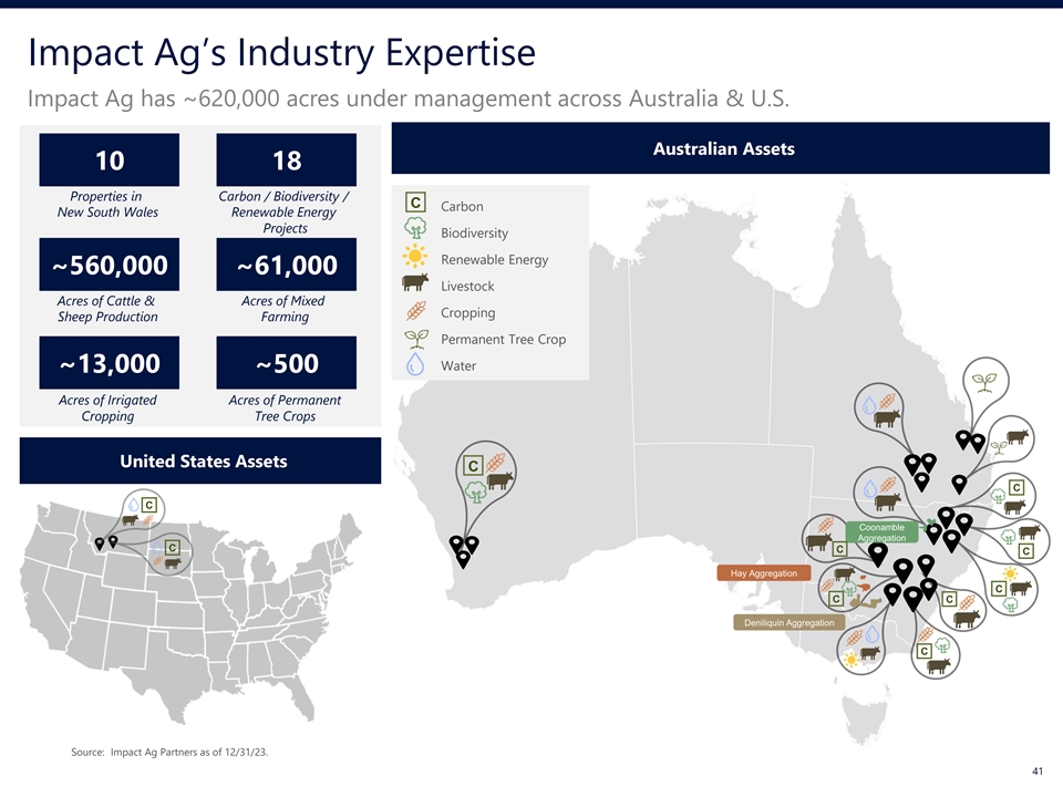 Impact Ag’s Industry Expertise Impact Ag has ~620,000 acres under management across Australia & U.S. Australian Assets 10 18 Properties in Carbon / Biodiversity / C Carbon New South Wales Renewable Energy Projects Biodiversity Renewable Energy ~560,000 ~61,000 Livestock Acres of Cattle & Acres of Mixed Cropping Sheep Production Farming Permanent Tree Crop Water ~13,000 ~500 Acres of Irrigated Acres of Permanent Cropping Tree Crops United States Assets C C C Coonamble Aggregation C C C Hay Aggregation C C C Deniliquin Aggregation C Source: Impact Ag Partners as of 12/31/23. 41