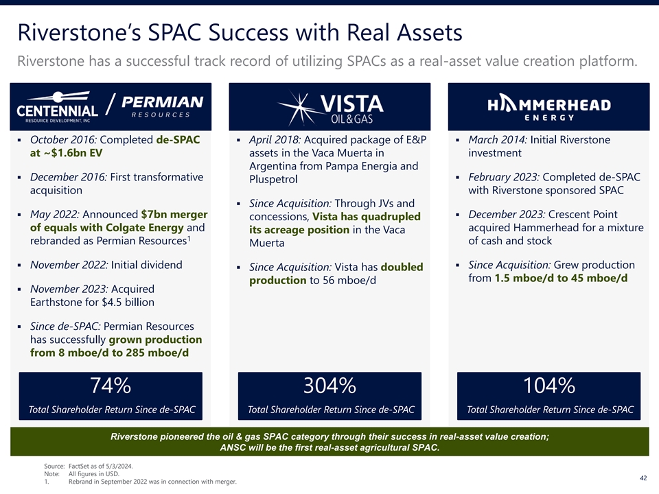 Riverstone’s SPAC Success with Real Assets Riverstone has a successful track record of utilizing SPACs as a real-asset value creation platform. / ▪ October 2016: Completed de-SPAC ▪ April 2018: Acquired package of E&P ▪ March 2014: Initial Riverstone at ~$1.6bn EV assets in the Vaca Muerta in investment Argentina from Pampa Energia and ▪ December 2016: First transformative ▪ February 2023: Completed de-SPAC Pluspetrol acquisition with Riverstone sponsored SPAC ▪ Since Acquisition: Through JVs and ▪ May 2022: Announced $7bn merger ▪ December 2023: Crescent Point concessions, Vista has quadrupled of equals with Colgate Energy and acquired Hammerhead for a mixture its acreage position in the Vaca 1 rebranded as Permian Resources of cash and stock Muerta ▪ November 2022: Initial dividend ▪ Since Acquisition: Grew production ▪ Since Acquisition: Vista has doubled from 1.5 mboe/d to 45 mboe/d production to 56 mboe/d ▪ November 2023: Acquired Earthstone for $4.5 billion ▪ Since de-SPAC: Permian Resources has successfully grown production from 8 mboe/d to 285 mboe/d 74% 304% 104% Total Shareholder Return Since de-SPAC Total Shareholder Return Since de-SPAC Total Shareholder Return Since de-SPAC Riverstone pioneered the oil & gas SPAC category through their success in real-asset value creation; ANSC will be the first real-asset agricultural SPAC. Source: FactSet as of 5/3/2024. Note: All figures in USD. 42 1. Rebrand in September 2022 was in connection with merger.