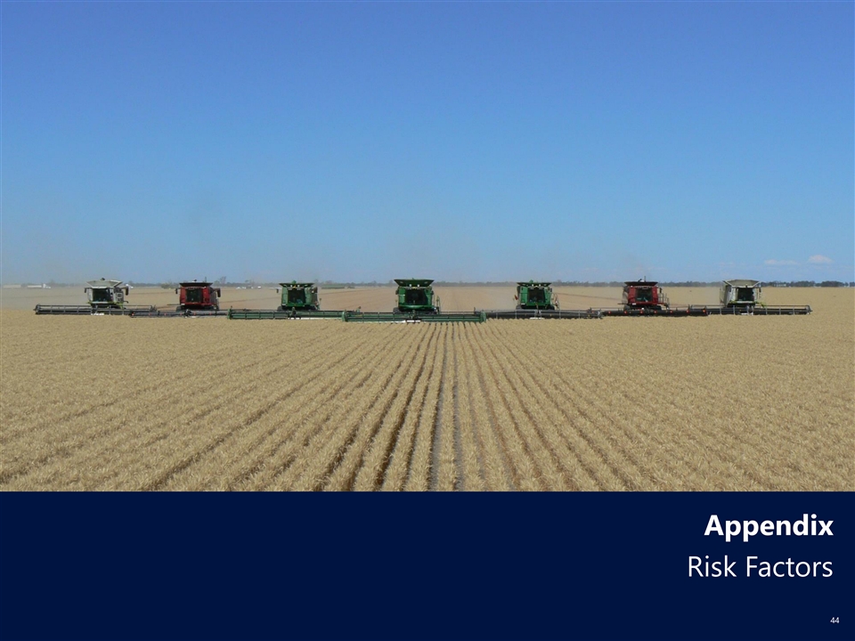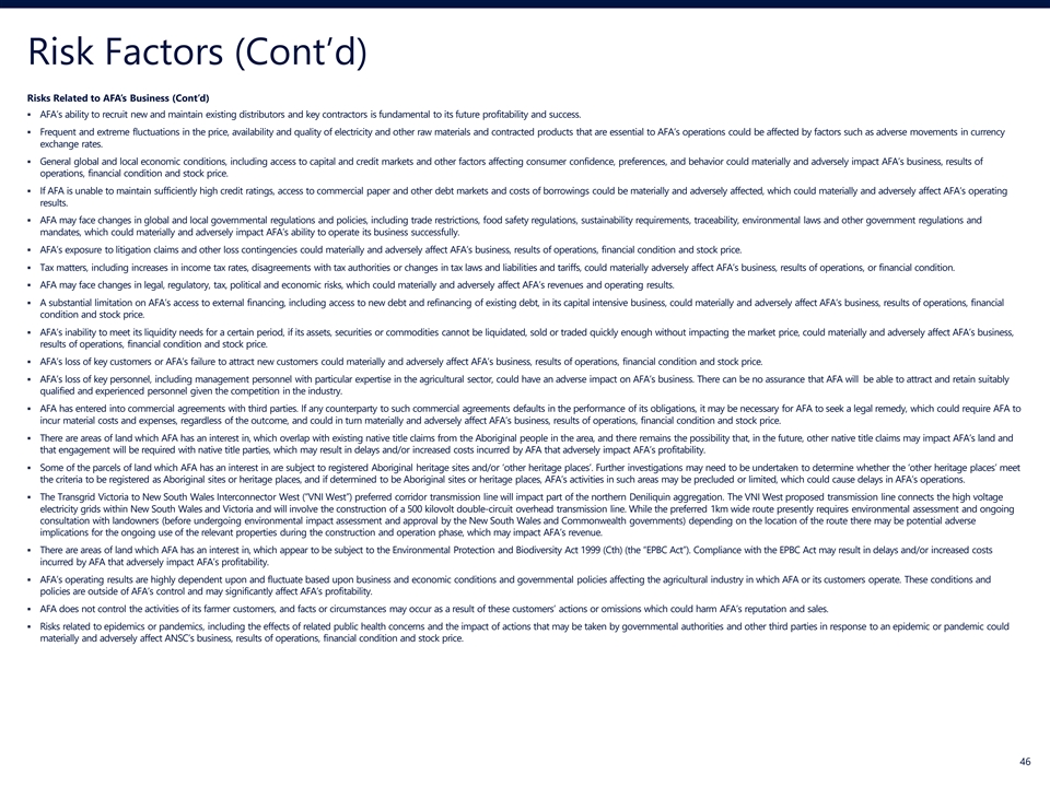 Risk Factors (Cont’d) Risks Related to AFA’s Business (Cont’d) ▪ AFA’s ability to recruit new and maintain existing distributors and key contractors is fundamental to its future profitability and success. ▪ Frequent and extreme fluctuations in the price, availability and quality of electricity and other raw materials and contracted products that are essential to AFA’s operations could be affected by factors such as adverse movements in currency exchange rates. ▪ General global and local economic conditions, including access to capital and credit markets and other factors affecting consumer confidence, preferences, and behavior could materially and adversely impact AFA’s business, results of operations, financial condition and stock price. ▪ If AFA is unable to maintain sufficiently high credit ratings, access to commercial paper and other debt markets and costs of borrowings could be materially and adversely affected, which could materially and adversely affect AFA’s operating results. ▪ AFA may face changes in global and local governmental regulations and policies, including trade restrictions, food safety regulations, sustainability requirements, traceability, environmental laws and other government regulations and mandates, which could materially and adversely impact AFA’s ability to operate its business successfully. ▪ AFA’s exposure to litigation claims and other loss contingencies could materially and adversely affect AFA’s business, results of operations, financial condition and stock price. ▪ Tax matters, including increases in income tax rates, disagreements with tax authorities or changes in tax laws and liabilities and tariffs, could materially adversely affect AFA’s business, results of operations, or financial condition. ▪ AFA may face changes in legal, regulatory, tax, political and economic risks, which could materially and adversely affect AFA’s revenues and operating results. ▪ A substantial limitation on AFA’s access to external financing, including access to new debt and refinancing of existing debt, in its capital intensive business, could materially and adversely affect AFA’s business, results of operations, financial condition and stock price. ▪ AFA’s inability to meet its liquidity needs for a certain period, if its assets, securities or commodities cannot be liquidated, sold or traded quickly enough without impacting the market price, could materially and adversely affect AFA’s business, results of operations, financial condition and stock price. ▪ AFA’s loss of key customers or AFA’s failure to attract new customers could materially and adversely affect AFA’s business, results of operations, financial condition and stock price. ▪ AFA’s loss of key personnel, including management personnel with particular expertise in the agricultural sector, could have an adverse impact on AFA’s business. There can be no assurance that AFA will be able to attract and retain suitably qualified and experienced personnel given the competition in the industry. ▪ AFA has entered into commercial agreements with third parties. If any counterparty to such commercial agreements defaults in the performance of its obligations, it may be necessary for AFA to seek a legal remedy, which could require AFA to incur material costs and expenses, regardless of the outcome, and could in turn materially and adversely affect AFA’s business, results of operations, financial condition and stock price. ▪ There are areas of land which AFA has an interest in, which overlap with existing native title claims from the Aboriginal people in the area, and there remains the possibility that, in the future, other native title claims may impact AFA’s land and that engagement will be required with native title parties, which may result in delays and/or increased costs incurred by AFA that adversely impact AFA’s profitability. ▪ Some of the parcels of land which AFA has an interest in are subject to registered Aboriginal heritage sites and/or ‘other heritage places’. Further investigations may need to be undertaken to determine whether the ‘other heritage places’ meet the criteria to be registered as Aboriginal sites or heritage places, and if determined to be Aboriginal sites or heritage places, AFA’s activities in such areas may be precluded or limited, which could cause delays in AFA’s operations. ▪ The Transgrid Victoria to New South Wales Interconnector West (“VNI West”) preferred corridor transmission line will impact part of the northern Deniliquin aggregation. The VNI West proposed transmission line connects the high voltage electricity grids within New South Wales and Victoria and will involve the construction of a 500 kilovolt double-circuit overhead transmission line. While the preferred 1km wide route presently requires environmental assessment and ongoing consultation with landowners (before undergoing environmental impact assessment and approval by the New South Wales and Commonwealth governments) depending on the location of the route there may be potential adverse implications for the ongoing use of the relevant properties during the construction and operation phase, which may impact AFA’s revenue. ▪ There are areas of land which AFA has an interest in, which appear to be subject to the Environmental Protection and Biodiversity Act 1999 (Cth) (the “EPBC Act”). Compliance with the EPBC Act may result in delays and/or increased costs incurred by AFA that adversely impact AFA’s profitability. ▪ AFA’s operating results are highly dependent upon and fluctuate based upon business and economic conditions and governmental policies affecting the agricultural industry in which AFA or its customers operate. These conditions and policies are outside of AFA’s control and may significantly affect AFA’s profitability. ▪ AFA does not control the activities of its farmer customers, and facts or circumsta