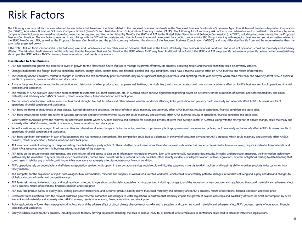 Risk Factors The following summary risk factors are certain of the risk factors that have been identified related to the proposed business combination (the “Proposed Business Combination”) between Agriculture & Natural Solutions Acquisition Corporation (the “SPAC”), Agriculture & Natural Solutions Company Limited (“NewCo”) and Australian Food & Agriculture Company Limited (“AFA”). The following list of summary risk factors is not exhaustive and is qualified in its entirety by more comprehensive disclosures contained in future documents to be prepared and filed or furnished by NewCo, the SPAC and AFA to the United States Securities and Exchange Commission (the “SEC”), including documents related to the Proposed Business Combination. The risk factors presented in such filings with the SEC will be consistent with the disclosure that would be required by a public company in its SEC filings, including with respect to business and securities matters related to the SPAC, NewCo and AFA, as well as the Proposed Business Combination and the public company following the closing of the Proposed Business Combination ( ANSC ), and may differ significantly from and be more extensive than the summaries presented below. If the SPAC, AFA or ANSC cannot address the following risks and uncertainties, or any other risks or difficulties that arise in the future, effectively, their business, financial condition, and results of operations could be materially and adversely affected. The risks described below are not the only ones that the Proposed Business Combination, the SPAC, AFA or ANSC may face. Additional risks of which the SPAC and AFA are presently not aware or presently believe not to be material may also impair the SPAC, AFA or ANSC’s business, financial condition, and results of operations. Risks Related to AFA’s Business ▪ AFA has experienced growth and expects to invest in growth for the foreseeable future. If it fails to manage its growth effectively, its business, operating results and financial condition could be adversely affected. ▪ Changes in domestic and foreign business conditions, markets, energy prices, interest rates, and financial, political and legal conditions, could have a material adverse effect on AFA’s business and results of operations. ▪ The variability of AFA’s business, related to changes in livestock and soft commodity price fluctuations, may cause significant changes in revenue and operating results year over year which could materially and adversely affect ANSC’s business, results of operations, financial condition and stock price. ▪ A rise in the price of inputs related to the production and distribution of AFA’s products, such as personnel, fertilizer, chemicals, feed, and transport costs, could have a material adverse effect on ANSC’s business, results of operations, financial condition and stock price. ▪ The majority of AFA’s sales are under short-term contracts to customers (i.e., meat processors, etc.) in Australia, which conveys significant negotiating power on customers for the acquisition of livestock and soft commodities, and could materially and adversely affect ANSC’s business, results of operations, financial condition and stock price. ▪ The occurrence of unforeseen natural events such as flood, drought, fire, hail, bushfires and other extreme weather conditions affecting AFA’s production and property could materially and adversely affect ANSC’s business, results of operations, financial condition and stock price. ▪ AFA faces the threat of an outbreak of crop disease, livestock disease and pestilence, the result of which could materially and adversely affect AFA’s business, results of operations, financial condition and stock price. ▪ AFA faces threats to the health and safety of livestock, agriculture and other environmental issues that could materially and adversely affect AFA’s business, results of operations, financial condition and stock price. ▪ Water scarcity in Australia given the relatively dry and variable climate where AFA does business and potential for prolonged periods of lower than average rainfall in Australia, along with the emergence of climate change, could materially and adversely affect AFA’s business, results of operations, financial condition and stock price. ▪ Wide fluctuations in prices of agricultural commodities and derivatives due to changes in factors including weather, crop disease, plantings, government programs and policies, could materially and adversely affect ANSC’s business, results of operations, financial condition and stock price. ▪ AFA faces significant competition in each of its businesses and has numerous competitors. This competition could lead to a decrease in the level of consumer demand for AFA’s products, which could materially and adversely affect ANSC’s business, results of operations, financial condition and stock price. ▪ AFA may be accused of infringing or misappropriating the intellectual property rights of others, whether or not meritorious. Defending against such intellectual property claims can be time-consuming, require substantial financial costs, and divert AFA’s resources away from its business efforts, regardless of the outcome. ▪ AFA relies on the secure storage, maintenance, and transmission of and access to data on its information technology systems. Even with commercially reasonable data security, integrity, and protection measures, the information technology systems may be vulnerable to system failures, cyber-based attacks, human error, natural disasters, network security breaches, other security incidents, or alleged violations of laws, regulations, or other obligations relating to data handling that could result in liability, any of which could impair AFA’s operations or adversely affect its reputation or financial condition. ▪ AFA’s operations rely on dependable and efficient transportation services. A disru