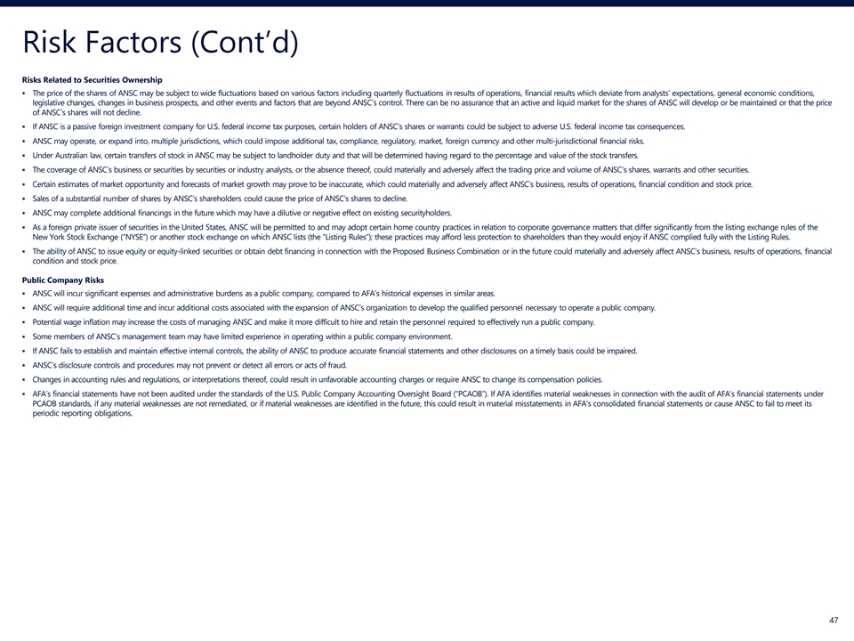Risk Factors (Cont’d) Risks Related to Securities Ownership ▪ The price of the shares of ANSC may be subject to wide fluctuations based on various factors including quarterly fluctuations in results of operations, financial results which deviate from analysts’ expectations, general economic conditions, legislative changes, changes in business prospects, and other events and factors that are beyond ANSC’s control. There can be no assurance that an active and liquid market for the shares of ANSC will develop or be maintained or that the price of ANSC’s shares will not decline. ▪ If ANSC is a passive foreign investment company for U.S. federal income tax purposes, certain holders of ANSC’s shares or warrants could be subject to adverse U.S. federal income tax consequences. ▪ ANSC may operate, or expand into, multiple jurisdictions, which could impose additional tax, compliance, regulatory, market, foreign currency and other multi-jurisdictional financial risks. ▪ Under Australian law, certain transfers of stock in ANSC may be subject to landholder duty and that will be determined having regard to the percentage and value of the stock transfers. ▪ The coverage of ANSC’s business or securities by securities or industry analysts, or the absence thereof, could materially and adversely affect the trading price and volume of ANSC’s shares, warrants and other securities. ▪ Certain estimates of market opportunity and forecasts of market growth may prove to be inaccurate, which could materially and adversely affect ANSC’s business, results of operations, financial condition and stock price. ▪ Sales of a substantial number of shares by ANSC’s shareholders could cause the price of ANSC’s shares to decline. ▪ ANSC may complete additional financings in the future which may have a dilutive or negative effect on existing securityholders. ▪ As a foreign private issuer of securities in the United States, ANSC will be permitted to and may adopt certain home country practices in relation to corporate governance matters that differ significantly from the listing exchange rules of the New York Stock Exchange (“NYSE”) or another stock exchange on which ANSC lists (the “Listing Rules”); these practices may afford less protection to shareholders than they would enjoy if ANSC complied fully with the Listing Rules. ▪ The ability of ANSC to issue equity or equity-linked securities or obtain debt financing in connection with the Proposed Business Combination or in the future could materially and adversely affect ANSC’s business, results of operations, financial condition and stock price. Public Company Risks ▪ ANSC will incur significant expenses and administrative burdens as a public company, compared to AFA’s historical expenses in similar areas. ▪ ANSC will require additional time and incur additional costs associated with the expansion of ANSC’s organization to develop the qualified personnel necessary to operate a public company. ▪ Potential wage inflation may increase the costs of managing ANSC and make it more difficult to hire and retain the personnel required to effectively run a public company. ▪ Some members of ANSC’s management team may have limited experience in operating within a public company environment. ▪ If ANSC fails to establish and maintain effective internal controls, the ability of ANSC to produce accurate financial statements and other disclosures on a timely basis could be impaired. ▪ ANSC’s disclosure controls and procedures may not prevent or detect all errors or acts of fraud. ▪ Changes in accounting rules and regulations, or interpretations thereof, could result in unfavorable accounting charges or require ANSC to change its compensation policies. ▪ AFA’s financial statements have not been audited under the standards of the U.S. Public Company Accounting Oversight Board (“PCAOB”). If AFA identifies material weaknesses in connection with the audit of AFA’s financial statements under PCAOB standards, if any material weaknesses are not remediated, or if material weaknesses are identified in the future, this could result in material misstatements in AFA’s consolidated financial statements or cause ANSC to fail to meet its periodic reporting obligations. 47