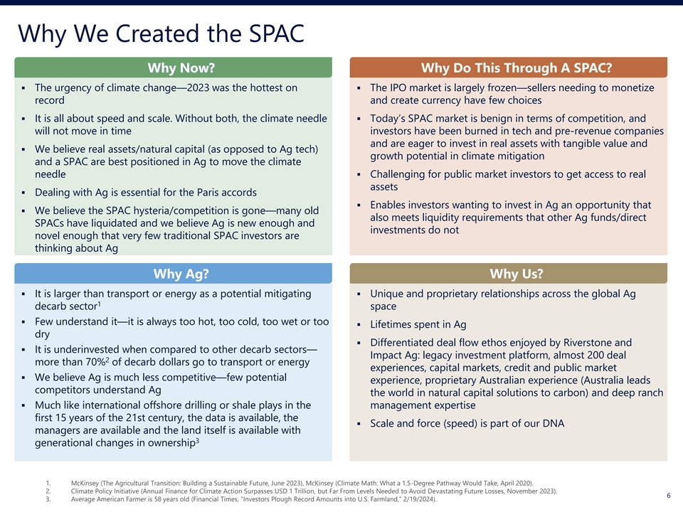 Why We Created the SPAC Why Now? Why Do This Through A SPAC? ▪ The urgency of climate change—2023 was the hottest on ▪ The IPO market is largely frozen—sellers needing to monetize record and create currency have few choices ▪ It is all about speed and scale. Without both, the climate needle ▪ Today’s SPAC market is benign in terms of competition, and will not move in time investors have been burned in tech and pre-revenue companies and are eager to invest in real assets with tangible value and ▪ We believe real assets/natural capital (as opposed to Ag tech) growth potential in climate mitigation and a SPAC are best positioned in Ag to move the climate needle▪ Challenging for public market investors to get access to real assets ▪ Dealing with Ag is essential for the Paris accords ▪ Enables investors wanting to invest in Ag an opportunity that ▪ We believe the SPAC hysteria/competition is gone—many old also meets liquidity requirements that other Ag funds/direct SPACs have liquidated and we believe Ag is new enough and investments do not novel enough that very few traditional SPAC investors are thinking about Ag Why Ag? Why Us? ▪ It is larger than transport or energy as a potential mitigating ▪ Unique and proprietary relationships across the global Ag 1 decarb sector space ▪ Few understand it—it is always too hot, too cold, too wet or too ▪ Lifetimes spent in Ag dry ▪ Differentiated deal flow ethos enjoyed by Riverstone and ▪ It is underinvested when compared to other decarb sectors— Impact Ag: legacy investment platform, almost 200 deal 2 more than 70% of decarb dollars go to transport or energy experiences, capital markets, credit and public market ▪ We believe Ag is much less competitive—few potential experience, proprietary Australian experience (Australia leads competitors understand Ag the world in natural capital solutions to carbon) and deep ranch ▪ Much like international offshore drilling or shale plays in the management expertise first 15 years of the 21st century, the data is available, the ▪ Scale and force (speed) is part of our DNA managers are available and the land itself is available with 3 generational changes in ownership 1. McKinsey (The Agricultural Transition: Building a Sustainable Future, June 2023), McKinsey (Climate Math: What a 1.5-Degree Pathway Would Take, April 2020). 2. Climate Policy Initiative (Annual Finance for Climate Action Surpasses USD 1 Trillion, but Far From Levels Needed to Avoid Devastating Future Losses, November 2023). 6 3. Average American Farmer is 58 years old (Financial Times, “Investors Plough Record Amounts into U.S. Farmland,” 2/19/2024).