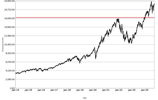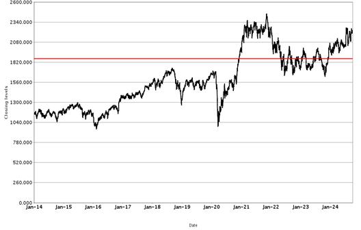 The following graphs set forth historical closing values of the Underlier for each offering for the period from January 1, 2014 to October 2, 2024. Each red line represents a hypothetical Buffer Value based on the closing value of the Underlier on October 2, 2024. We obtained the information in the graphs from Bloomberg Financial Markets, without independent investigation. We cannot give you assurance that the performance of the Underlier will result in the return of all of your initial investment.