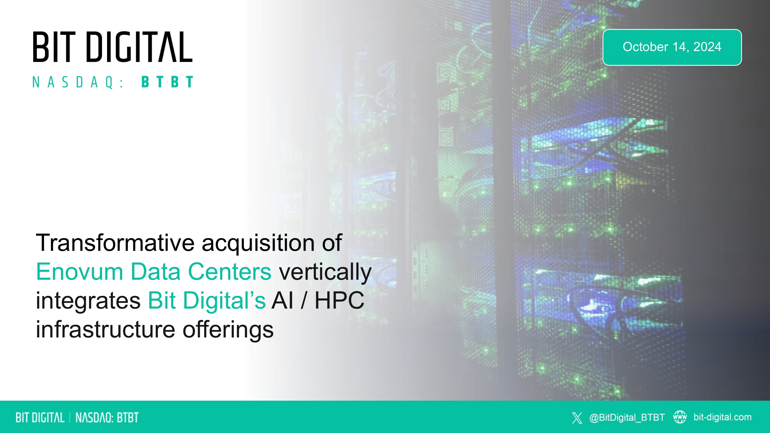 Transformative acquisition of Enovum Data Centers vertically integrates Bit Digital’s AI / HPC infrastructure offerings October 14, 2024