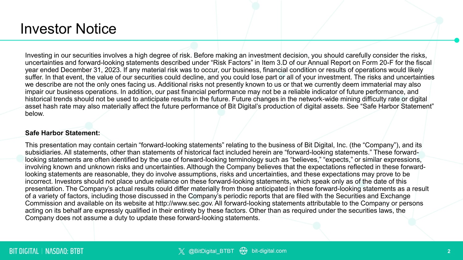 Investing in our securities involves a high degree of risk. Before making an investment decision, you should carefully consider the risks, uncertainties and forward - looking statements described under “Risk Factors” in Item 3.D of our Annual Report on Form 20 - F for the fiscal year ended December 31, 2023. If any material risk was to occur, our business, financial condition or results of operations would likely suffer. In that event, the value of our securities could decline, and you could lose part or all of your investment. The risks and uncertainties we describe are not the only ones facing us. Additional risks not presently known to us or that we currently deem immaterial may also impair our business operations. In addition, our past financial performance may not be a reliable indicator of future performance, and historical trends should not be used to anticipate results in the future. Future changes in the network - wide mining difficulty rate or digital asset hash rate may also materially affect the future performance of Bit Digital’s production of digital assets. See “Safe Harbor Statement” below. Safe Harbor Statement: This presentation may contain certain “forward - looking statements” relating to the business of Bit Digital, Inc. (the “Company”), and its subsidiaries. All statements, other than statements of historical fact included herein are “forward - looking statements.” These forward - looking statements are often identified by the use of forward - looking terminology such as “believes,” “expects,” or similar expressions, involving known and unknown risks and uncertainties. Although the Company believes that the expectations reflected in these forward - looking statements are reasonable, they do involve assumptions, risks and uncertainties, and these expectations may prove to be incorrect. Investors should not place undue reliance on these forward - looking statements, which speak only as of the date of this presentation. The Company’s actual results could differ materially from those anticipated in these forward - looking statements as a result of a variety of factors, including those discussed in the Company’s periodic reports that are filed with the Securities and Exchange Commission and available on its website at http://www.sec.gov. All forward - looking statements attributable to the Company or persons acting on its behalf are expressly qualified in their entirety by these factors. Other than as required under the securities laws, the Company does not assume a duty to update these forward - looking statements. Investor Notice 2