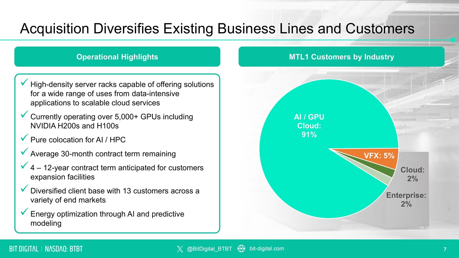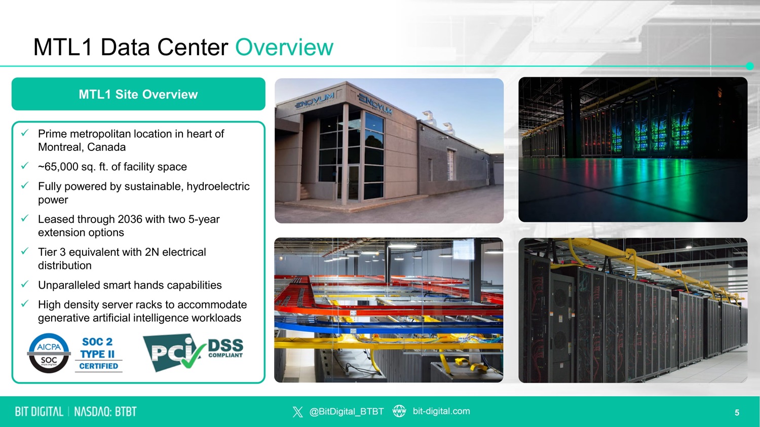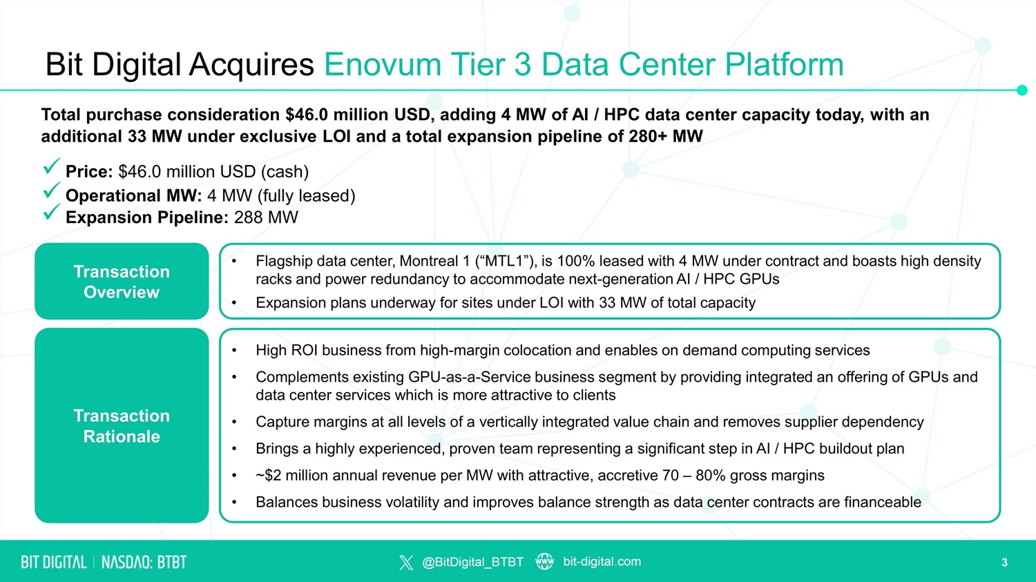 Bit Digital Acquires Enovum Tier 3 Data Center Platform Total purchase consideration $46.0 million USD, adding 4 MW of AI / HPC data center capacity today, with an additional 33 MW under exclusive LOI and a total expansion pipeline of 280+ MW x Price: $46.0 million USD (cash) x Operational MW: 4 MW (fully leased) x Expansion Pipeline: 288 MW Transaction Overview Transaction Rationale • High ROI business from high - margin colocation and enables on demand computing services • Complements existing GPU - as - a - Service business segment by providing integrated an offering of GPUs and data center services which is more attractive to clients • Capture margins at all levels of a vertically integrated value chain and removes supplier dependency • Brings a highly experienced, proven team representing a significant step in AI / HPC buildout plan • ~$2 million annual revenue per MW with attractive, accretive 70 – 80% gross margins • Balances business volatility and improves balance strength as data center contracts are financeable • Flagship data center, Montreal 1 (“MTL1”), is 100% leased with 4 MW under contract and boasts high density racks and power redundancy to accommodate next - generation AI / HPC GPUs • Expansion plans underway for sites under LOI with 33 MW of total capacity 3