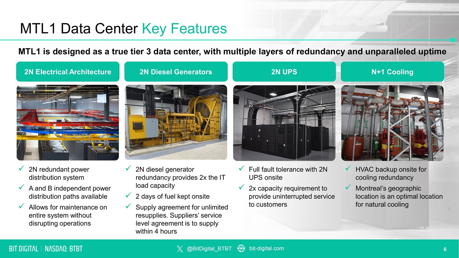 MTL1 Data Center Overview MTL1 Site Overview x Prime metropolitan location in heart of Montreal, Canada x ~65,000 sq. ft. of facility space x Fully powered by sustainable, hydroelectric power x Leased through 2036 with two 5 - year extension options x Tier 3 equivalent with 2N electrical distribution x Unparalleled smart hands capabilities x High density server racks to accommodate generative artificial intelligence workloads 5