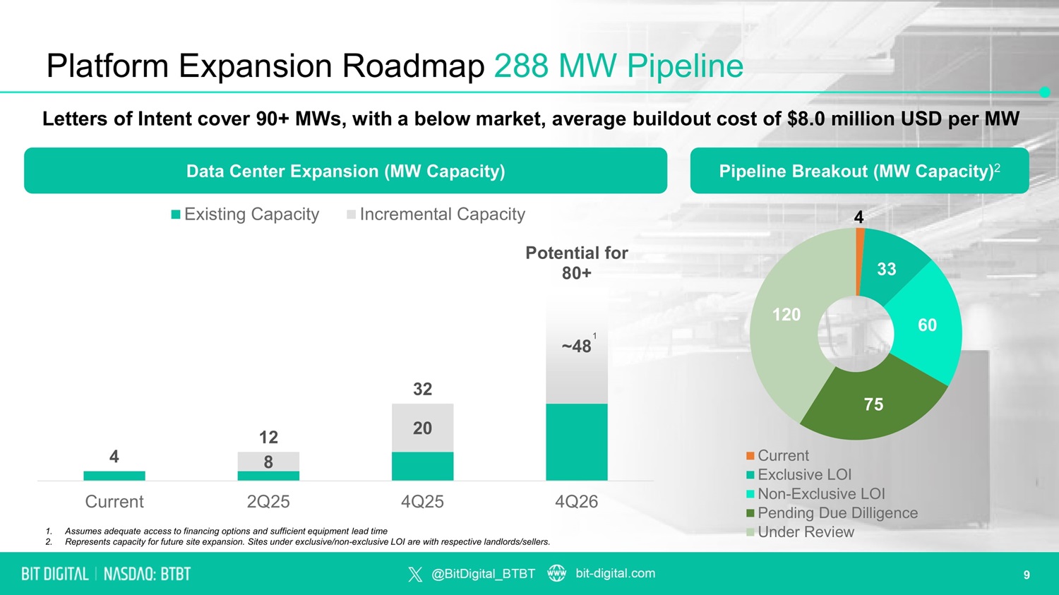 4 33 60 75 120 Current Exclusive LOI Non - Exclusive LOI Pending Due Dilligence Under Review 8 20 ~48 4 12 32 Potential for 80+ 4Q26 Existing Capacity Incremental Capacity Platform Expansion Roadmap 288 MW Pipeline Letters of Intent cover 90+ MWs, with a below market, average buildout cost of $8.0 million USD per MW Data Center Expansion (MW Capacity) Pipeline Breakout (MW Capacity) 2 9 Current 2Q25 4Q25 1. Assumes adequate access to financing options and sufficient equipment lead time 2. Represents capacity for future site expansion. Sites under exclusive/non - exclusive LOI are with respective landlords/sellers. 1