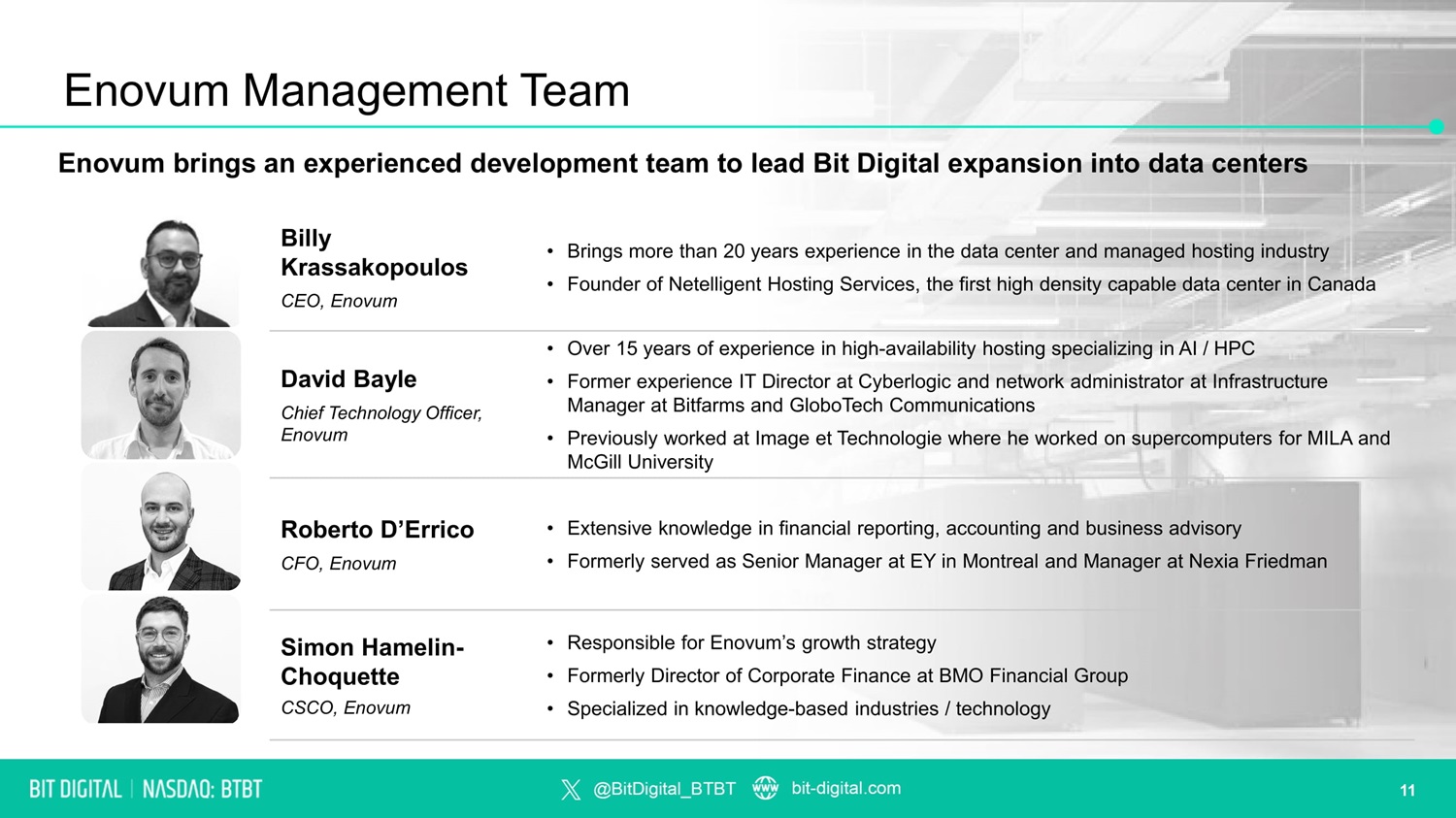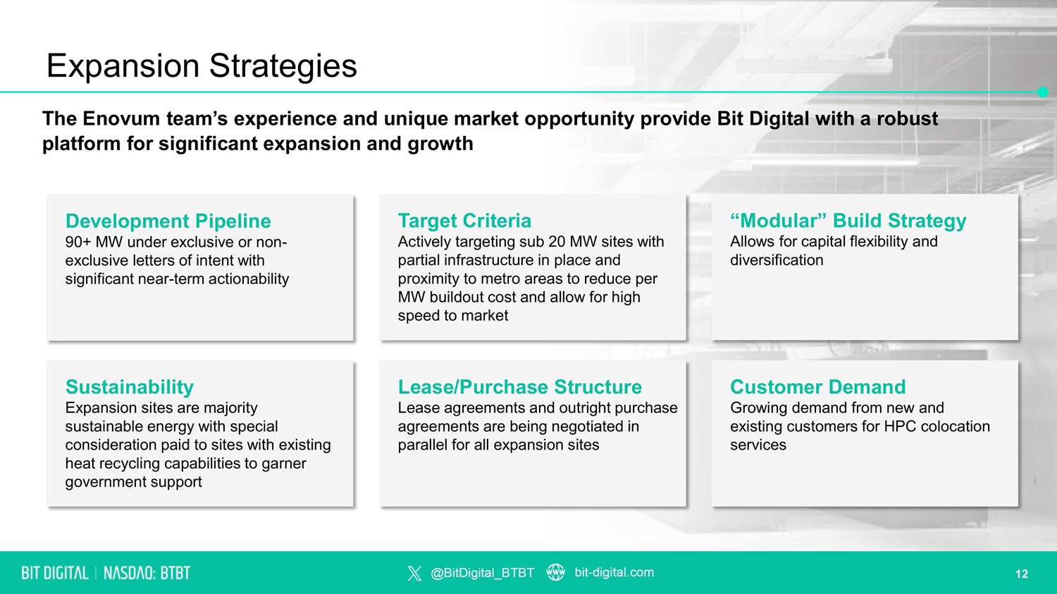 Enovum Management Team • Brings more than 20 years experience in the data center and managed hosting industry • Founder of Netelligent Hosting Services, the first high density capable data center in Canada Billy Krassakopoulos CEO, Enovum • Over 15 years of experience in high - availability hosting specializing in AI / HPC • Former experience IT Director at Cyberlogic and network administrator at Infrastructure Manager at Bitfarms and GloboTech Communications • Previously worked at Image et Technologie where he worked on supercomputers for MILA and McGill University David Bayle Chief Technology Officer, Enovum • Extensive knowledge in financial reporting, accounting and business advisory • Formerly served as Senior Manager at EY in Montreal and Manager at Nexia Friedman Roberto D’Errico CFO, Enovum • Responsible for Enovum’s growth strategy • Formerly Director of Corporate Finance at BMO Financial Group • Specialized in knowledge - based industries / technology Simon Hamelin - Choquette CSCO, Enovum Enovum brings an experienced development team to lead Bit Digital expansion into data centers 11
