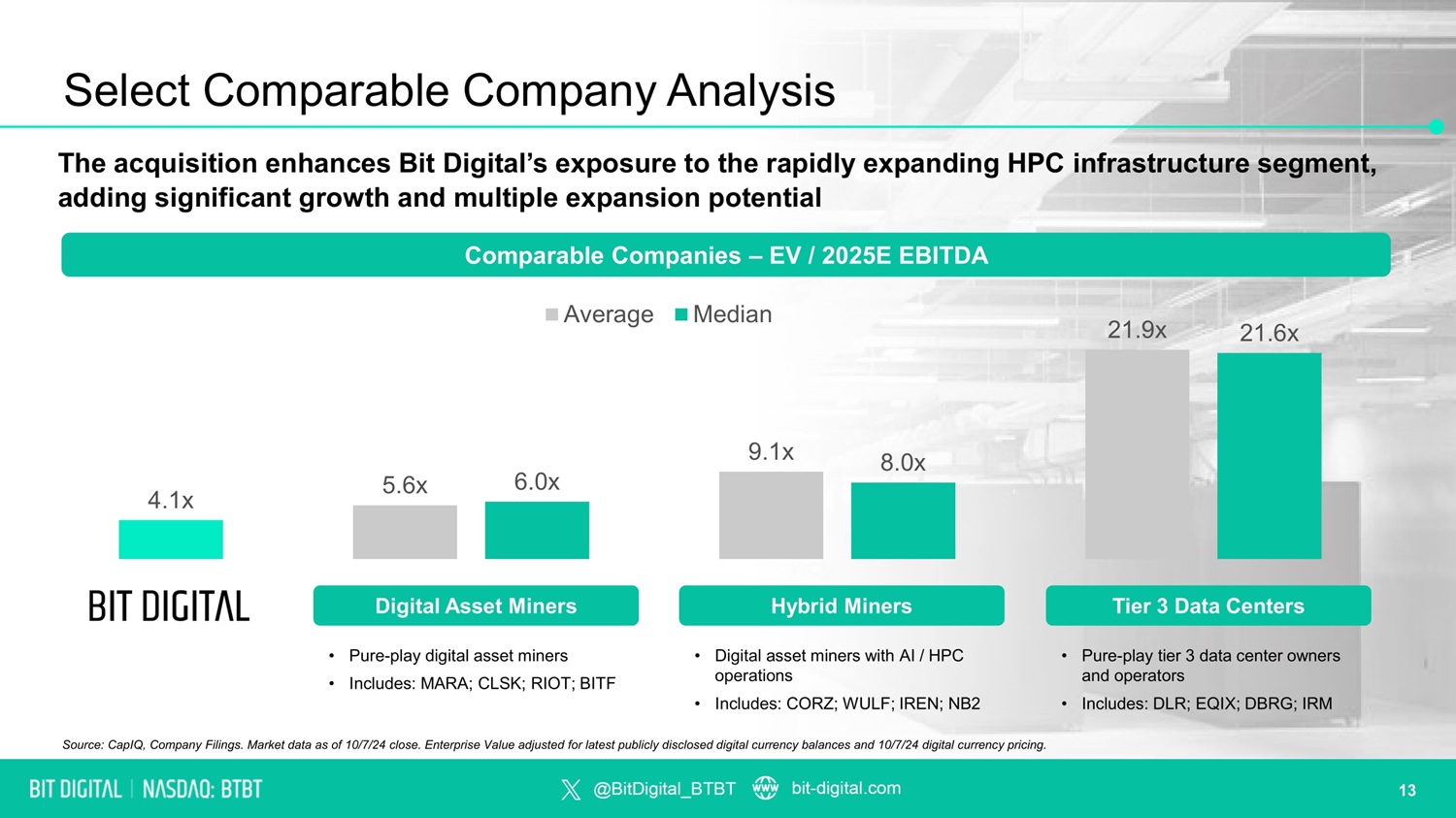 Select Comparable Company Analysis The acquisition enhances Bit Digital’s exposure to the rapidly expanding HPC infrastructure segment, adding significant growth and multiple expansion potential • Pure - play digital asset miners • Includes: MARA; CLSK; RIOT; BITF Digital Asset Miners • Digital asset miners with AI / HPC operations • Includes: CORZ; WULF; IREN; NB2 Hybrid Miners • Pure - play tier 3 data center owners and operators • Includes: DLR; EQIX; DBRG; IRM Tier 3 Data Centers Source: CapIQ, Company Filings. Market data as of 10/7/24 close. Enterprise Value adjusted for latest publicly disclosed digital currency balances and 10/7/24 digital currency pricing. 5.6x 9.1x 21.9x 4.1x 6.0x 8.0x 21.6x Comparable Companies – EV / 2025E EBITDA Average Median 13