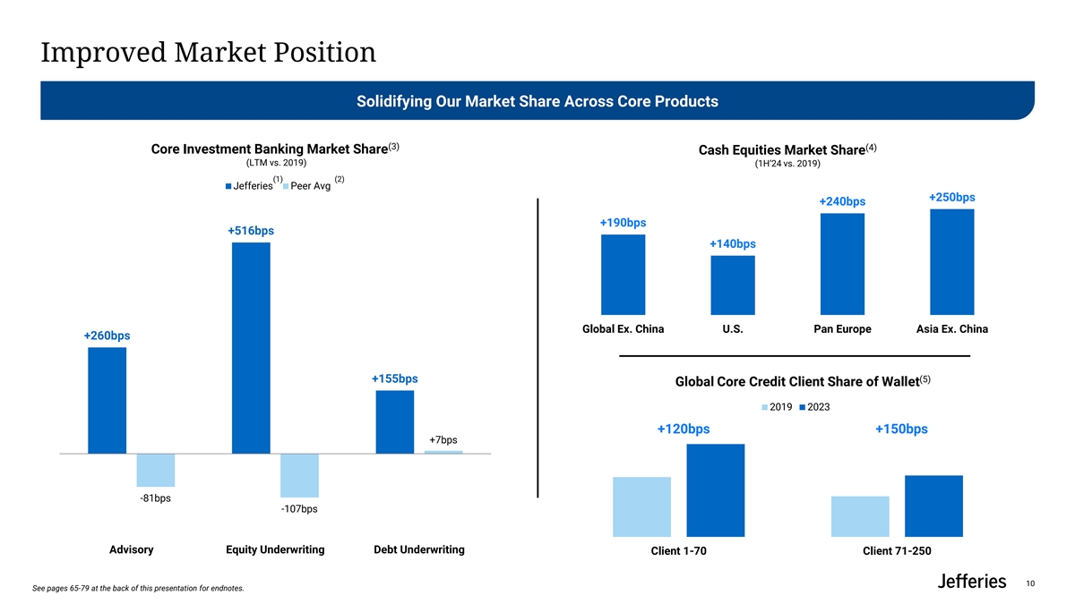 Growth Outpacing the Market (4)(5) (4) (4) Core Investment Banking Net Revenues Equities Net Revenues Fixed Income Net Revenues (LTM vs. 2019) (LTM vs. 2019) (LTM vs. 2019) (1) (2) (3) (1) (2) (3) (1) (2) (3) Jefferies Peer Avg. Total Market Jefferies Peer Avg. Total Market Jefferies Peer Avg. Total Market 91% 83% 67% 59% 49% 35% 33% 5% -2% 9 See pages 65-79 at the back of this presentation for endnotes.