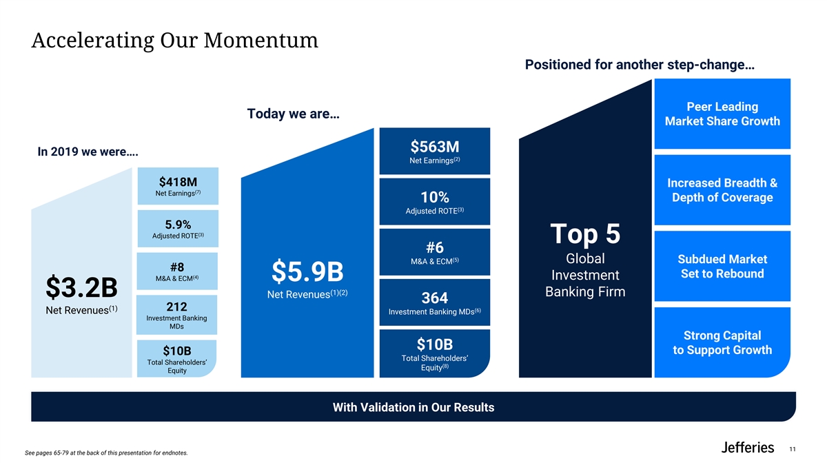 Improved Market Position Solidifying Our Market Share Across Core Products (3) (4) Core Investment Banking Market Share Cash Equities Market Share (LTM vs. 2019) (1H’24 vs. 2019) (1) (2) Jefferies Peer Avg +250bps +240bps +190bps +516bps +140bps Global Ex. China U.S. Pan Europe Asia Ex. China +260bps +155bps (5) Global Core Credit Client Share of Wallet 2019 2023 +120bps +150bps +7bps -81bps -107bps Advisory Equity Underwriting Debt Underwriting Client 1-70 Client 71-250 10 See pages 65-79 at the back of this presentation for endnotes.