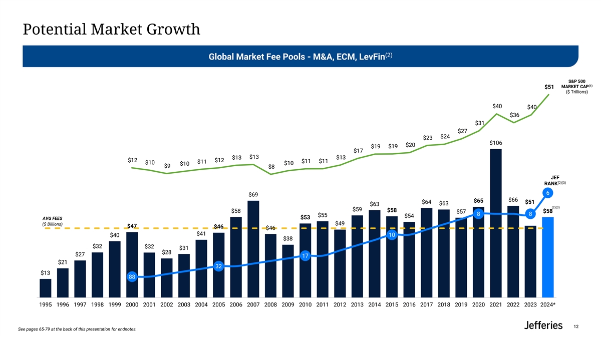 Potential Market Growth (2) Global Market Fee Pools - M&A, ECM, LevFin S&P 500 (1) MARKET CAP $51 ($ Trillions) $40 $40 $36 $31 $27 $24 $23 $106 $20 $19 $19 $17 $13 $13 $13 $12 $12 $11 $11 $11 $10 $10 $10 $9 $8 JEF (2)(3) RANK 6 $69 $66 $65 $64 $51 $63 $63 (2)(3) $59 $58 $58 $58 $57 8 8 $55 $54 AVG FEES $53 $49 ($ Billions) $47 $46 $46 $41 10 $40 $38 $32 $32 $31 $28 $27 17 $21 32 $13 88 1995 1996 1997 1998 1999 2000 2001 2002 2003 2004 2005 2006 2007 2008 2009 2010 2011 2012 2013 2014 2015 2016 2017 2018 2019 2020 2021 2022 2023 2024* 12 See pages 65-79 at the back of this presentation for endnotes.