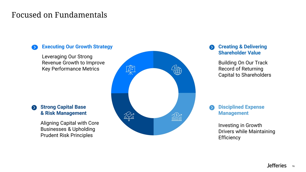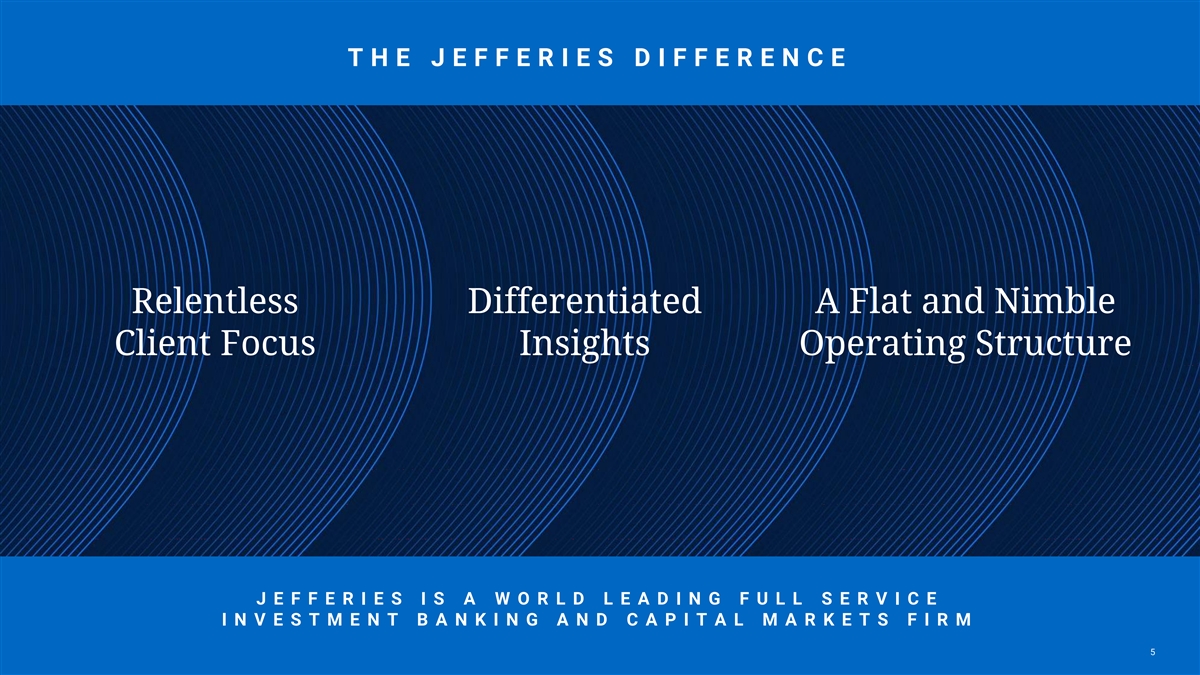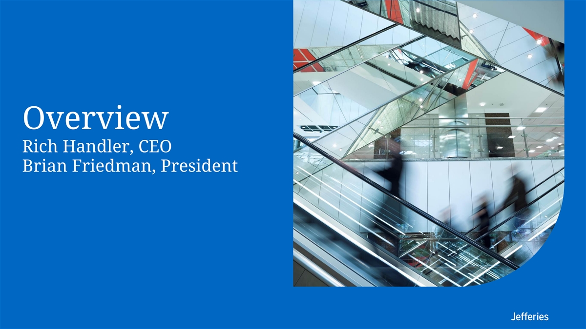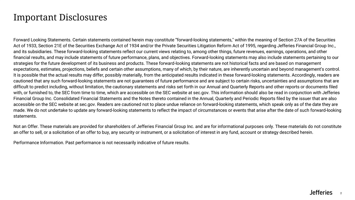 Important Disclosures Forward Looking Statements. Certain statements contained herein may constitute “forward-looking statements, within the meaning of Section 27A of the Securities Act of 1933, Section 21E of the Securities Exchange Act of 1934 and/or the Private Securities Litigation Reform Act of 1995, regarding Jefferies Financial Group Inc., and its subsidiaries. These forward-looking statements reflect our current views relating to, among other things, future revenues, earnings, operations, and other financial results, and may include statements of future performance, plans, and objectives. Forward-looking statements may also include statements pertaining to our strategies for the future development of its business and products. These forward-looking statements are not historical facts and are based on management expectations, estimates, projections, beliefs and certain other assumptions, many of which, by their nature, are inherently uncertain and beyond management’s control. It is possible that the actual results may differ, possibly materially, from the anticipated results indicated in these forward-looking statements. Accordingly, readers are cautioned that any such forward-looking statements are not guarantees of future performance and are subject to certain risks, uncertainties and assumptions that are difficult to predict including, without limitation, the cautionary statements and risks set forth in our Annual and Quarterly Reports and other reports or documents filed with, or furnished to, the SEC from time to time, which are accessible on the SEC website at sec.gov. This information should also be read in conjunction with Jefferies Financial Group Inc. Consolidated Financial Statements and the Notes thereto contained in the Annual, Quarterly and Periodic Reports filed by the issuer that are also accessible on the SEC website at sec.gov. Readers are cautioned not to place undue reliance on forward-looking statements, which speak only as of the date they are made. We do not undertake to update any forward-looking statements to reflect the impact of circumstances or events that arise after the date of such forward-looking statements. Not an Offer. These materials are provided for shareholders of Jefferies Financial Group Inc. and are for informational purposes only. These materials do not constitute an offer to sell, or a solicitation of an offer to buy, any security or instrument, or a solicitation of interest in any fund, account or strategy described herein. Performance Information. Past performance is not necessarily indicative of future results. 2