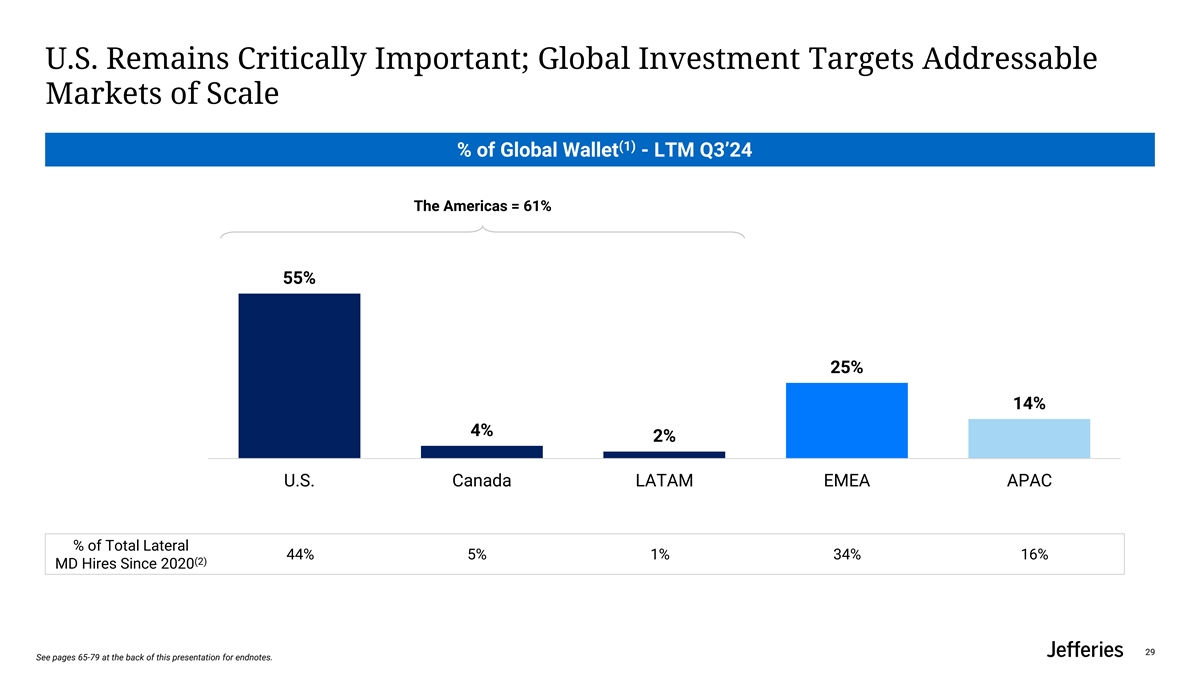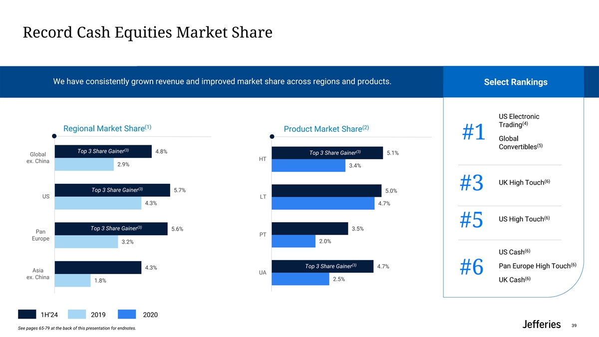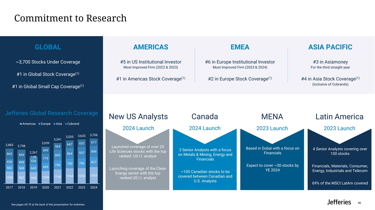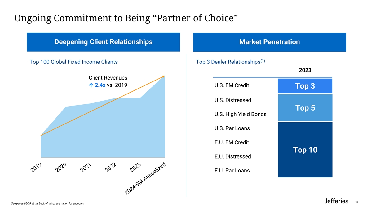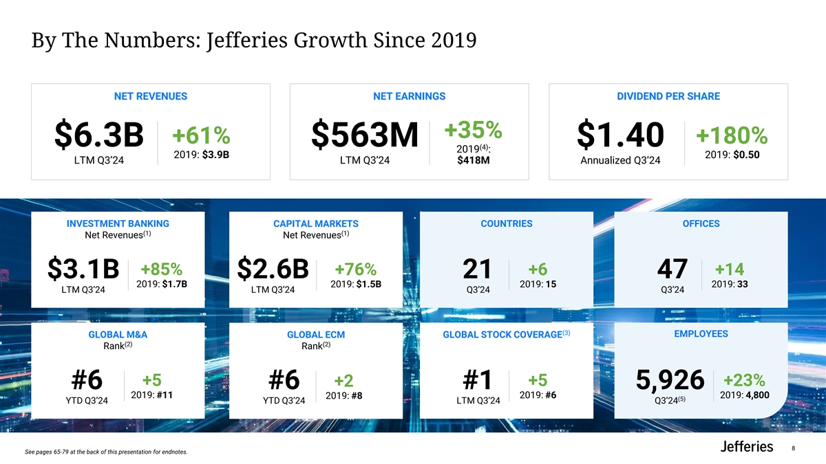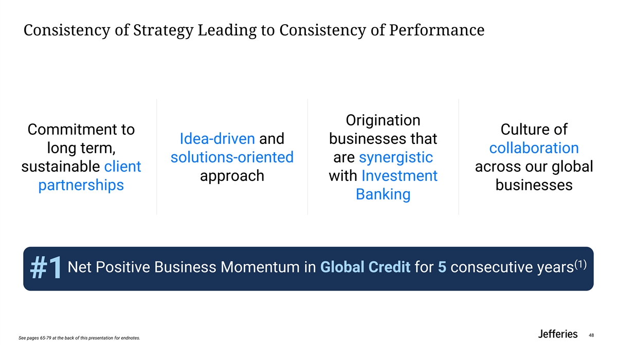Endnotes These notes refer to page 33 (1) Source: Dealogic. YTD as of 8/31/24 (2) Regions do not sum to global total due to exclusion of Canada, LATAM, Caribbeans, China and Japan These notes refer to page 34 (1) Source: Dealogic. YTD as of 8/31/24 (2) Regions do not sum to global total due to exclusion of Canada, LATAM, Caribbean, China and Japan These notes refer to page 38 (1) Revenues are presented net of allocations of interest income and interest expense. During the third quarter ended August 31, 2023, we refined our allocated net interest methodology to better reflect net interest expense across our business units based on use of capital. Historical periods have been recast to conform with the revised methodology back to 2019 (2) Source: Revenues are compiled by Jefferies and derived from publicly available company filings, including Form 10-Qs and 10-Ks, earnings releases and supplements . Peers include Bank of America, Citi, Goldman Sachs, JP Morgan and Morgan Stanley These notes refer to page 39 (1) Regional market share is sourced from a third-party market survey and represents 1H24 vs. 2019 (2) Source: Product market share is sourced from a third-party market survey and represents Global ex. China 1H24 vs. 2020 (3) Top 3 share gainer comment compares 1H24 market share to 2020 market share (4) US Electronic Trading rank represents 2024 Sales ranking, sourced from Institutional Investor (5) Global Convertibles rank is a 2024 overall rank, sourced from Greenwich (6) Sourced from a third-party market survey and represents 1H24 70