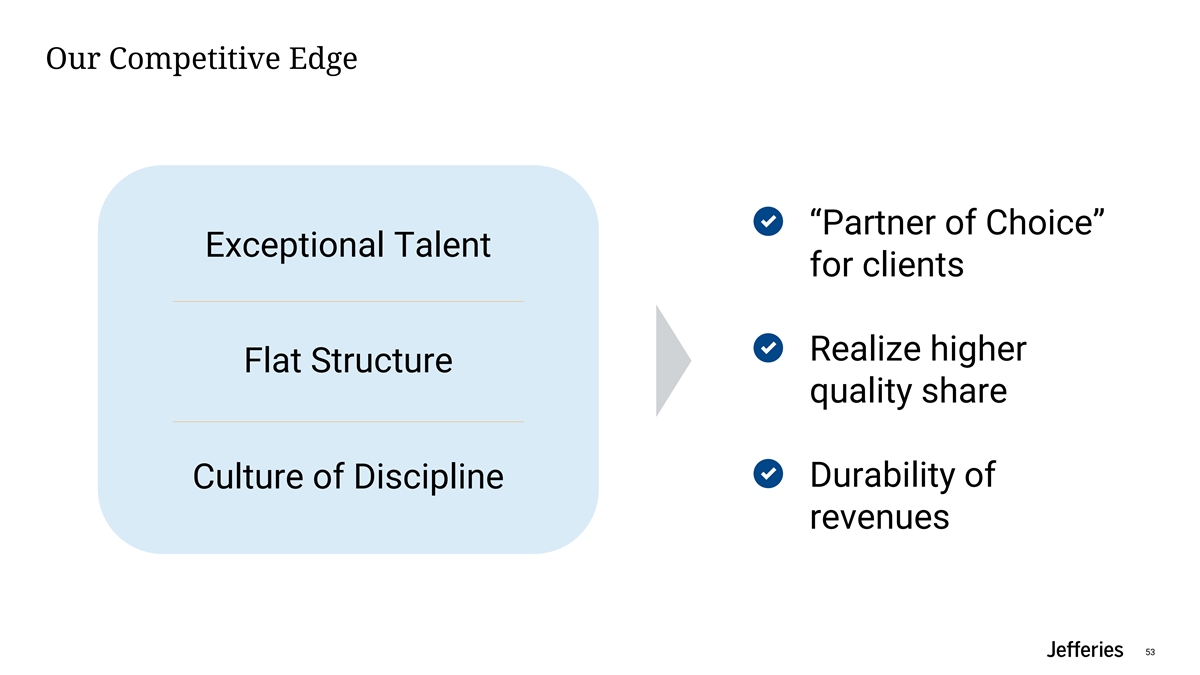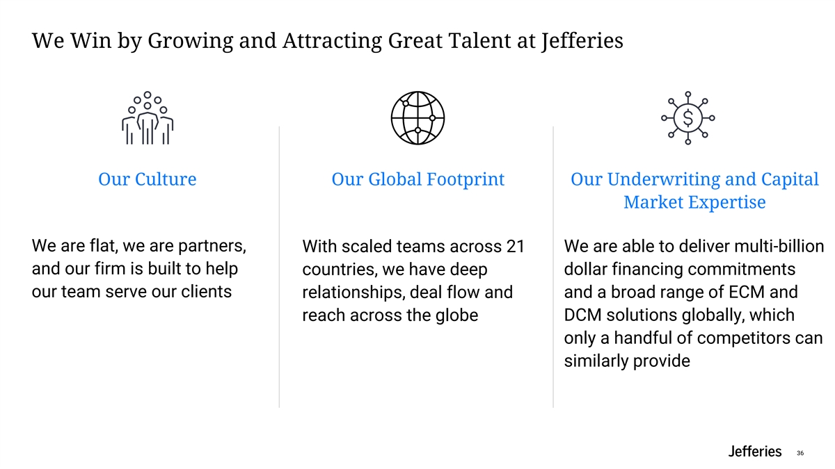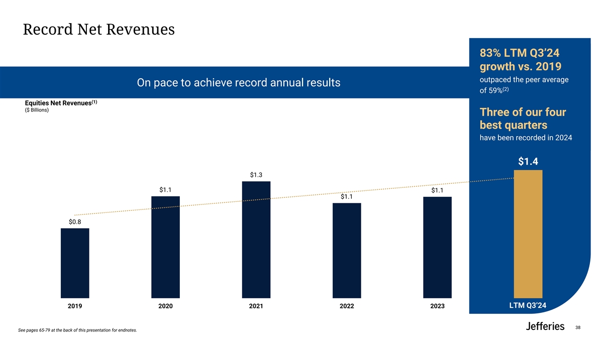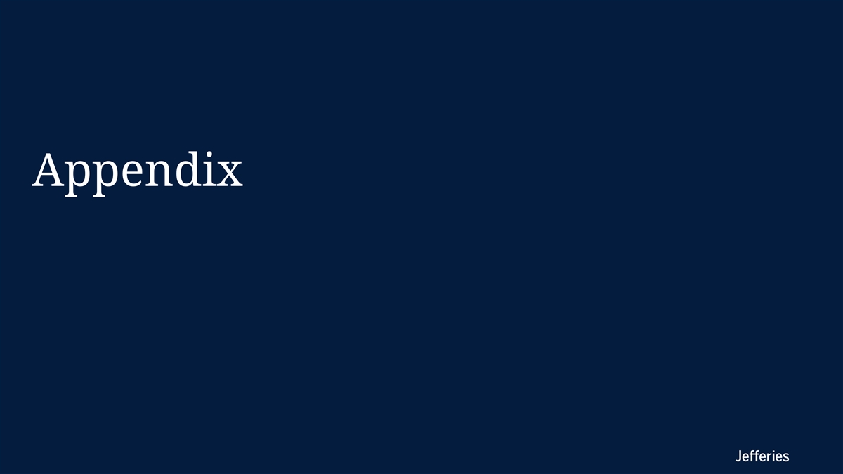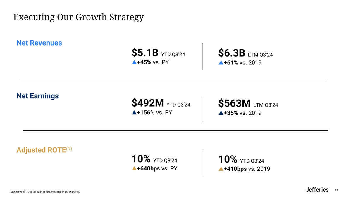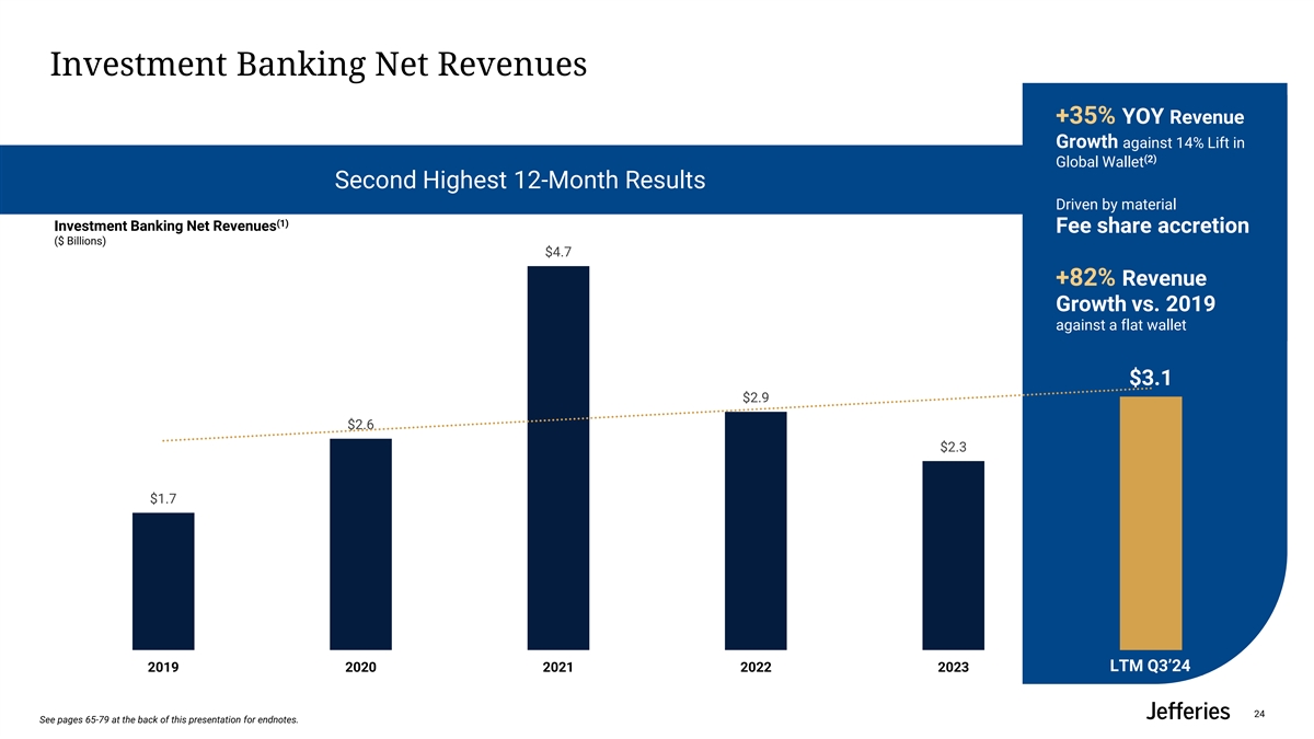 Endnotes These notes refer to page 33 (1) Source: Dealogic. YTD as of 8/31/24 (2) Regions do not sum to global total due to exclusion of Canada, LATAM, Caribbeans, China and Japan These notes refer to page 34 (1) Source: Dealogic. YTD as of 8/31/24 (2) Regions do not sum to global total due to exclusion of Canada, LATAM, Caribbean, China and Japan These notes refer to page 38 (1) Revenues are presented net of allocations of interest income and interest expense. During the third quarter ended August 31, 2023, we refined our allocated net interest methodology to better reflect net interest expense across our business units based on use of capital. Historical periods have been recast to conform with the revised methodology back to 2019 (2) Source: Revenues are compiled by Jefferies and derived from publicly available company filings, including Form 10-Qs and 10-Ks, earnings releases and supplements . Peers include Bank of America, Citi, Goldman Sachs, JP Morgan and Morgan Stanley These notes refer to page 39 (1) Regional market share is sourced from a third-party market survey and represents 1H24 vs. 2019 (2) Source: Product market share is sourced from a third-party market survey and represents Global ex. China 1H24 vs. 2020 (3) Top 3 share gainer comment compares 1H24 market share to 2020 market share (4) US Electronic Trading rank represents 2024 Sales ranking, sourced from Institutional Investor (5) Global Convertibles rank is a 2024 overall rank, sourced from Greenwich (6) Sourced from a third-party market survey and represents 1H24 70