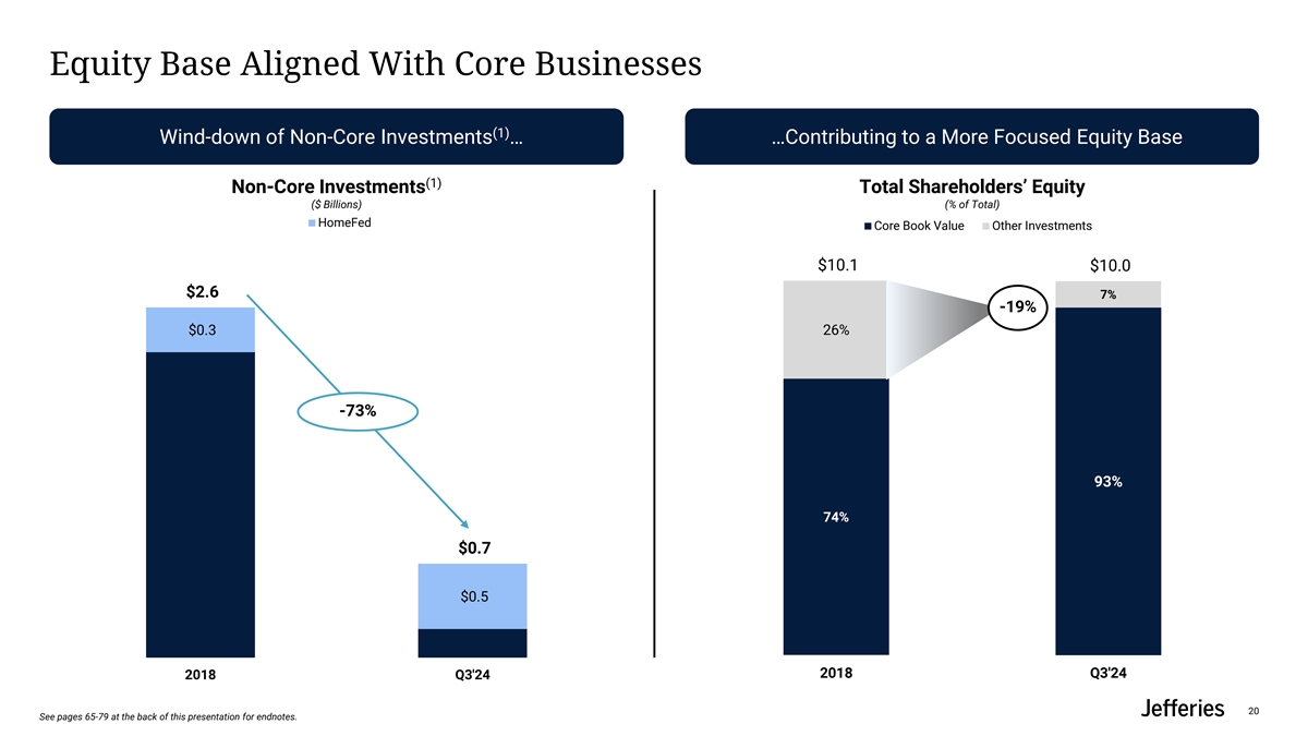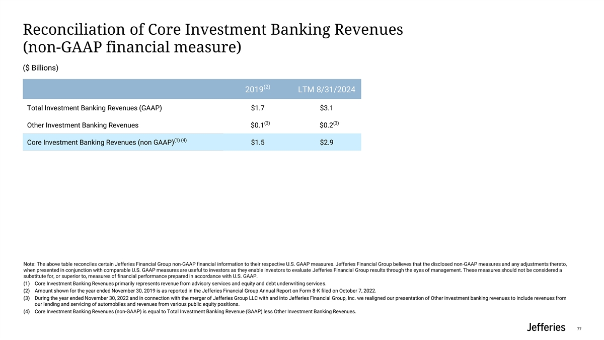 Reconciliation of Core Investment Banking Revenues (non-GAAP financial measure) ($ Billions) (2) 2019 LTM 8/31/2024 Total Investment Banking Revenues (GAAP) $1.7 $3.1 (3) (3) Other Investment Banking Revenues $0.1 $0.2 (1) (4) Core Investment Banking Revenues (non GAAP) $1.5 $2.9 Note: The above table reconciles certain Jefferies Financial Group non-GAAP financial information to their respective U.S. GAAP measures. Jefferies Financial Group believes that the disclosed non-GAAP measures and any adjustments thereto, when presented in conjunction with comparable U.S. GAAP measures are useful to investors as they enable investors to evaluate Jefferies Financial Group results through the eyes of management. These measures should not be considered a substitute for, or superior to, measures of financial performance prepared in accordance with U.S. GAAP. (1) Core Investment Banking Revenues primarily represents revenue from advisory services and equity and debt underwriting services. (2) Amount shown for the year ended November 30, 2019 is as reported in the Jefferies Financial Group Annual Report on Form 8-K filed on October 7, 2022. (3) During the year ended November 30, 2022 and in connection with the merger of Jefferies Group LLC with and into Jefferies Financial Group, Inc. we realigned our presentation of Other investment banking revenues to include revenues from our lending and servicing of automobiles and revenues from various public equity positions. (4) Core Investment Banking Revenues (non-GAAP) is equal to Total Investment Banking Revenue (GAAP) less Other Investment Banking Revenues. 77
