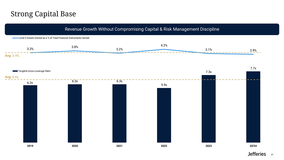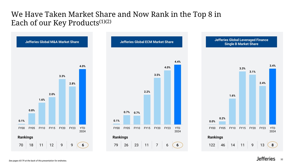 We Have Taken Market Share and Now Rank in the Top 8 in (1)(2) Each of our Key Products Jefferies Global Leveraged Finance Jefferies Global M&A Market Share Jefferies Global ECM Market Share Single B Market Share 4.4% 3.4% 4.0% 4.0% 3.3% 3.1% 3.5% 3.3% 2.4% 2.8% 2.2% 2.0% 1.6% 1.6% 0.8% 0.7% 0.7% 0.2% 0.1% 0.1% 0.0% FY00 FY05 FY10 FY15 FY20 FY23 YTD FY00 FY05 FY10 FY15 FY20 FY23 YTD FY00 FY05 FY10 FY15 FY20 FY23 YTD 2024 2024 2024 Rankings Rankings Rankings 70 18 11 12 9 9 6 79 26 23 11 7 6 6 122 46 14 11 9 13 8 32 See pages 65-79 at the back of this presentation for endnotes.