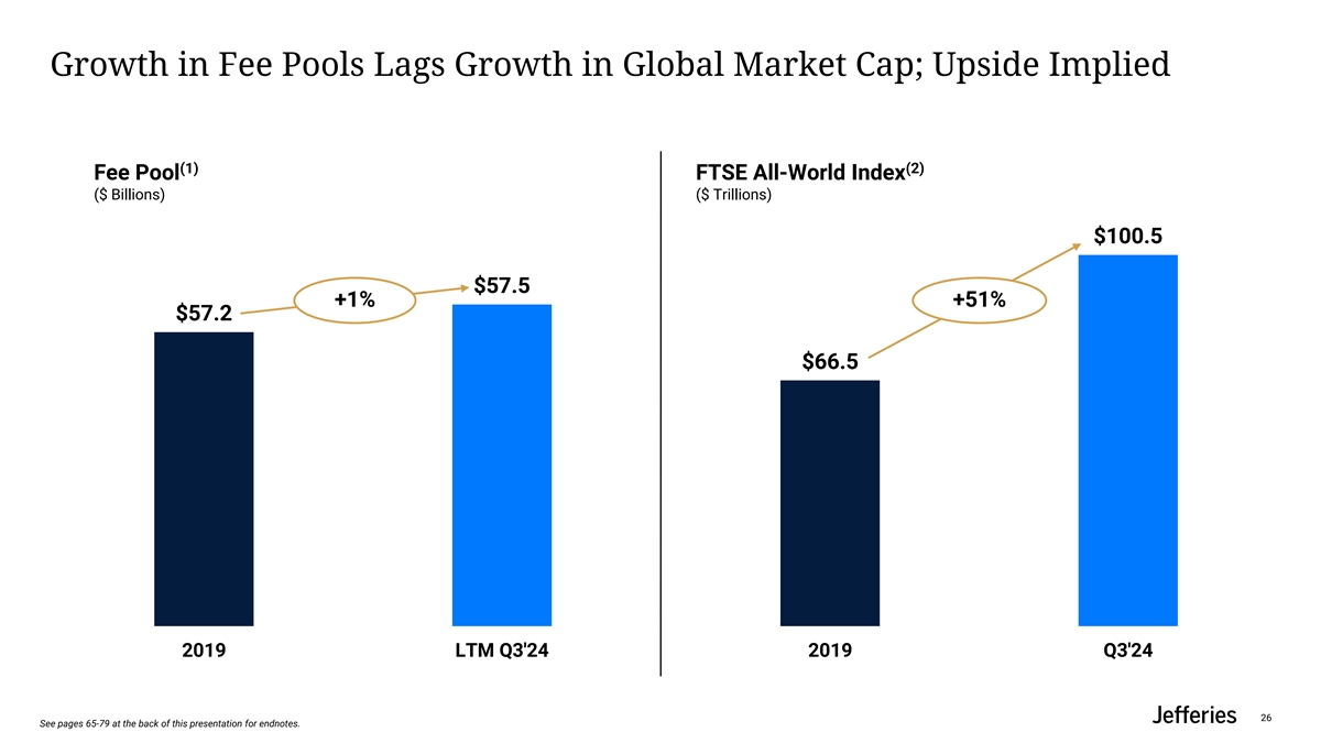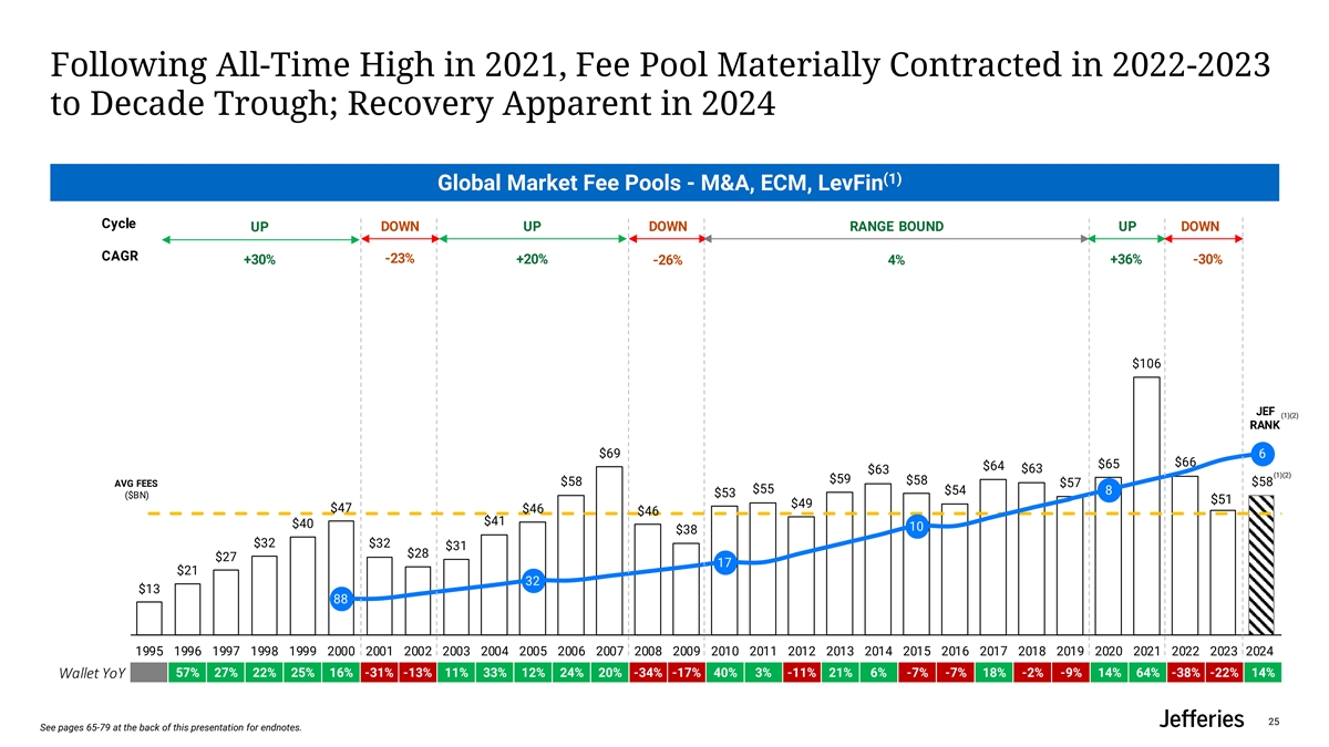 Following All-Time High in 2021, Fee Pool Materially Contracted in 2022-2023 to Decade Trough; Recovery Apparent in 2024 (1) Global Market Fee Pools - M&A, ECM, LevFin ` Cycle DOWN UP DOWN RANGE BOUND UP DOWN UP CAGR -23% +30% +20% +36% -30% -26% 4% $106 JEF (1)(2) RANK $69 6 $66 $65 $64 $64 $63 $63 (1)(2) $59 $58 $58 AVG FEES $57 $58 $55 $54 8 $53 ($BN) $51 $51 $49 $47 $46 $46 $41 $40 10 $38 $32 $32 $31 $28 $27 17 $21 32 $13 88 1995 1996 1997 1998 1999 2000 2001 2002 2003 2004 2005 2006 2007 2008 2009 2010 2011 2012 2013 2014 2015 2016 2017 2018 2019 2020 2021 2022 2023 2024* 2025P Wallet YoY 57% 27% 22% 25% 16% -31% -13% 11% 33% 12% 24% 20% -34% -17% 40% 3% -11% 21% 6% -7% -7% 18% -2% -9% 14% 64% -38% -22% 14% 25 See pages 65-79 at the back of this presentation for endnotes.