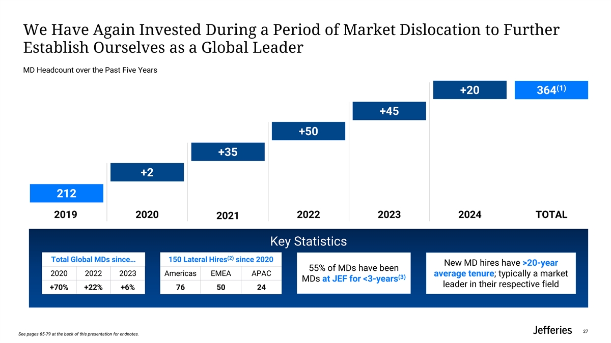 We Have Again Invested During a Period of Market Dislocation to Further Establish Ourselves as a Global Leader MD Headcount over the Past Five Years (1) +20 364 +45 +50 +35 +2 212 2019 2020 2022 2023 2024 TOTAL 2021 Key Statistics (2) otal Global Ds since… 150 Lateral Hires since 2020 New MD hires have >20-year 55% of MDs have been 2020 2022 2023 Americas EMEA APAC average tenure; typically a market (3) MDs at JEF for <3-years leader in their respective field +70% +22% +6% 76 50 24 27 See pages 65-79 at the back of this presentation for endnotes.